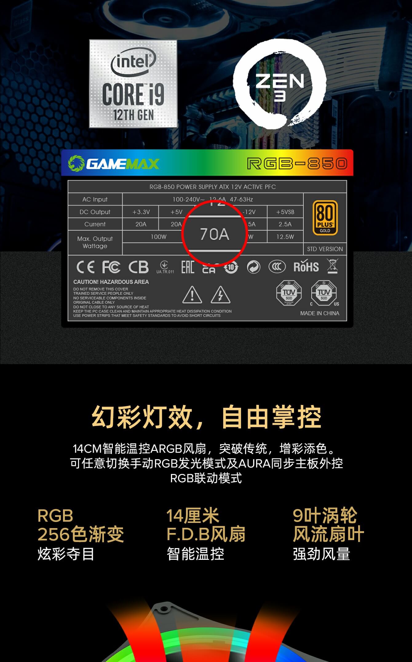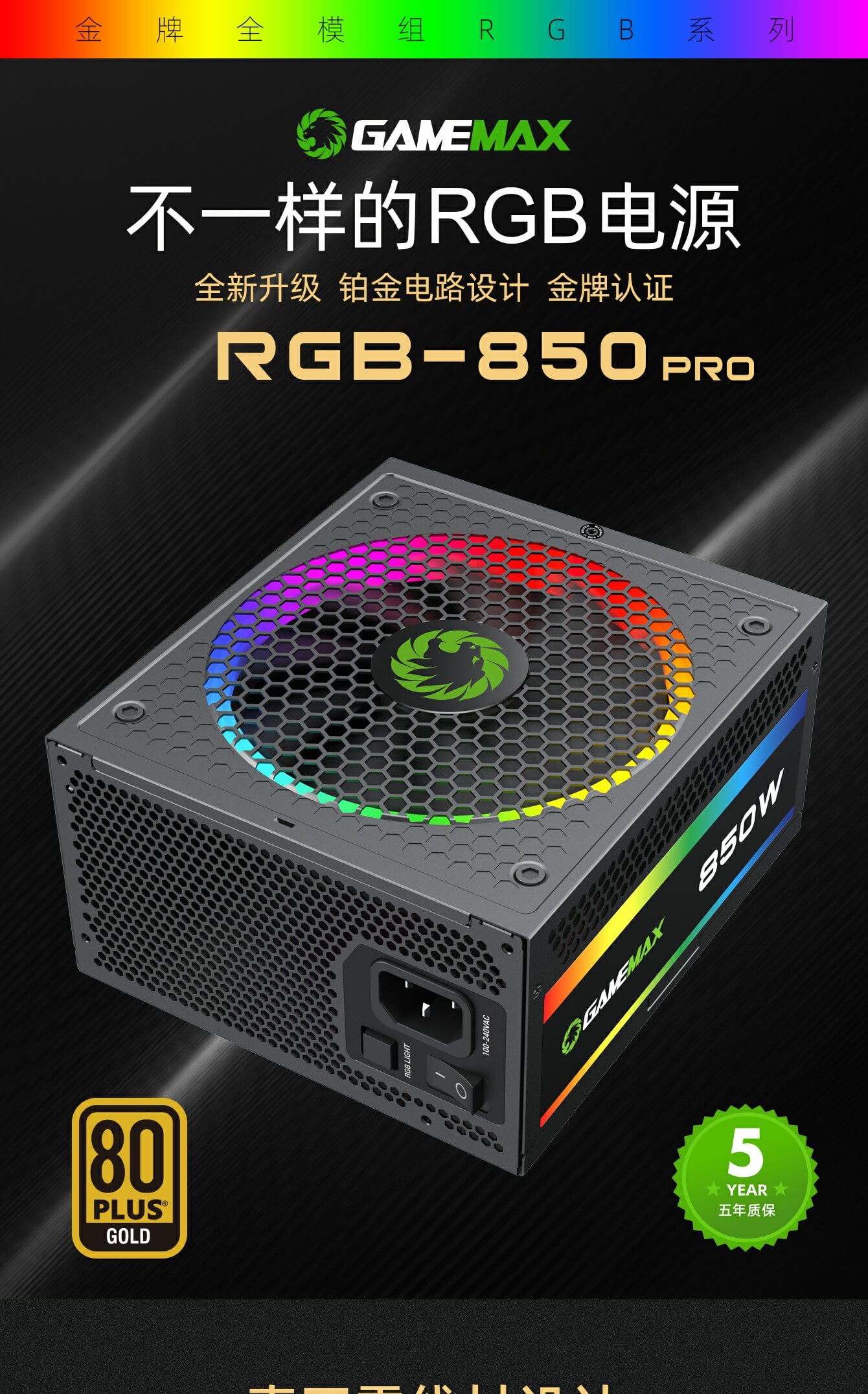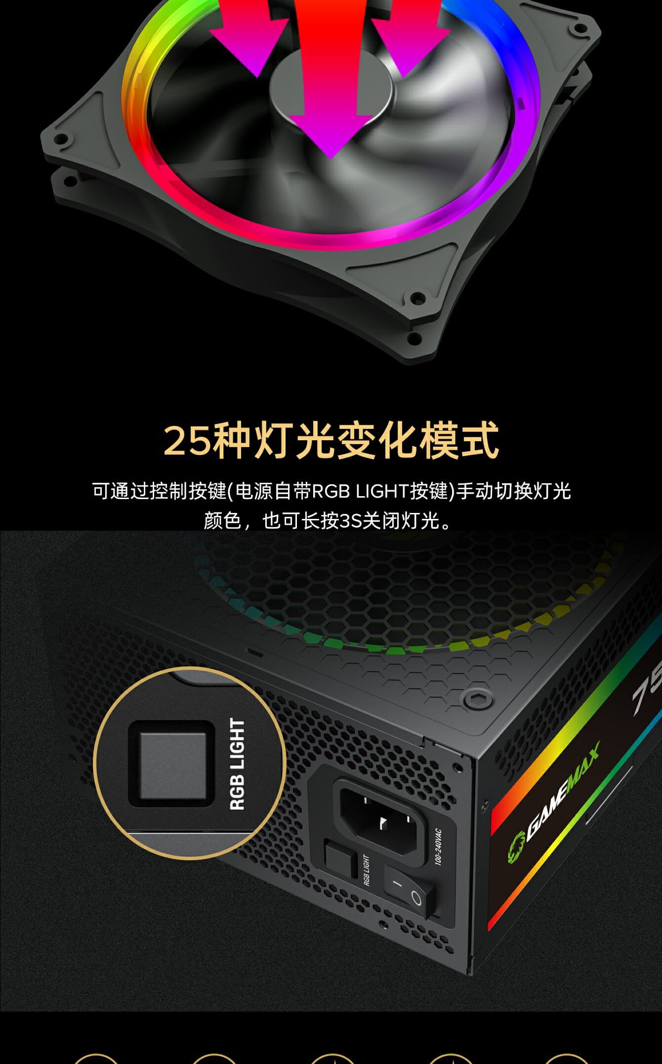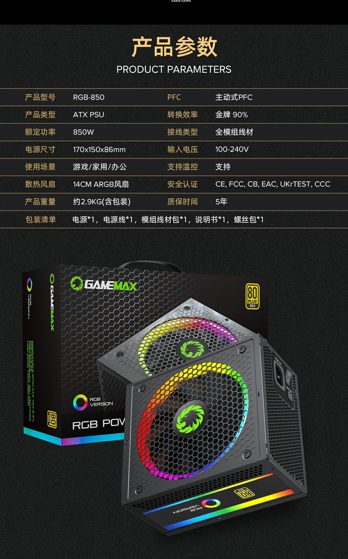 GameMax RGB-850 PRO 全模块化 80+ 金牌认证,强大的单路 +12V 输出设计有助于确保稳定,并可靠地为其他 PC 组件供电。配备 140 毫米 ARGB 风扇有助于提供更明亮和令人惊叹的灯光效果,支持与华硕、技嘉、微星和华擎兼容的 RGB 主板同步,提供无数照明可能性。