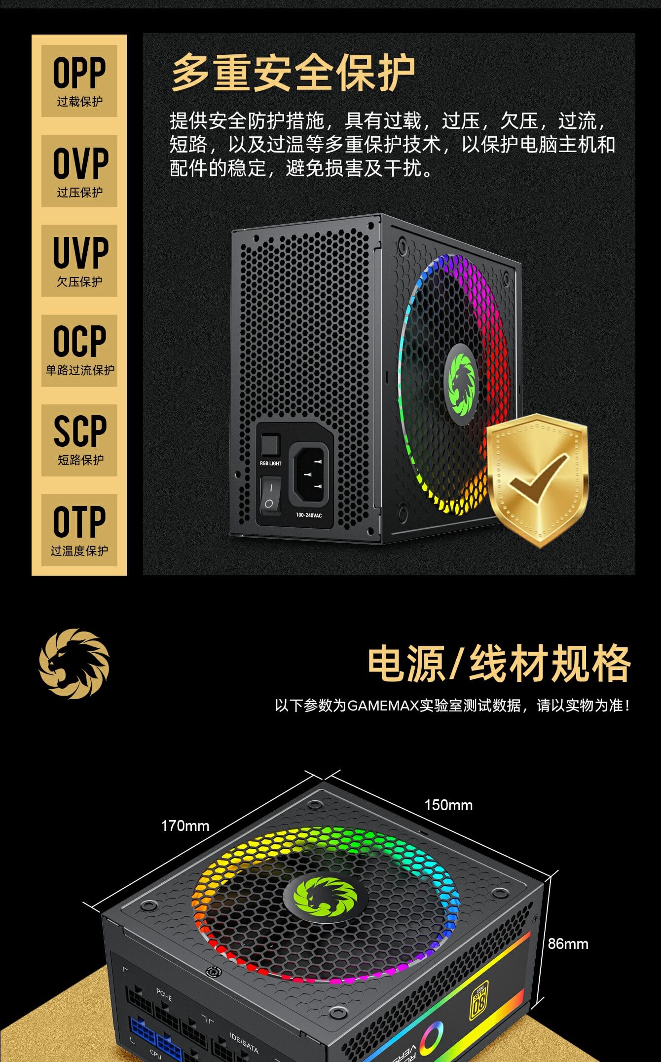 输出与保护:强大的+12V单轨提供稳定的直流输出,支持高端显卡和PC系统。优秀的电容器提供稳定性、耐用性和可靠性,包括 OPP/OVP/UVP/SCP/OCP 电气保护。