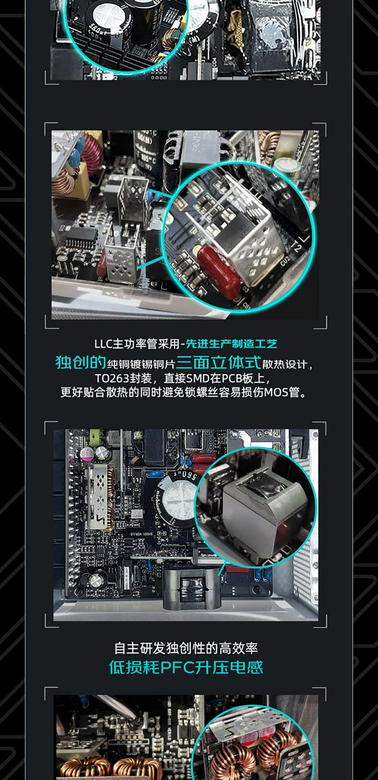 LLC主功率管采用纯铜镀锡铜片三面立体式散热设计--自主研发技术核心,提高电源的转换效率。