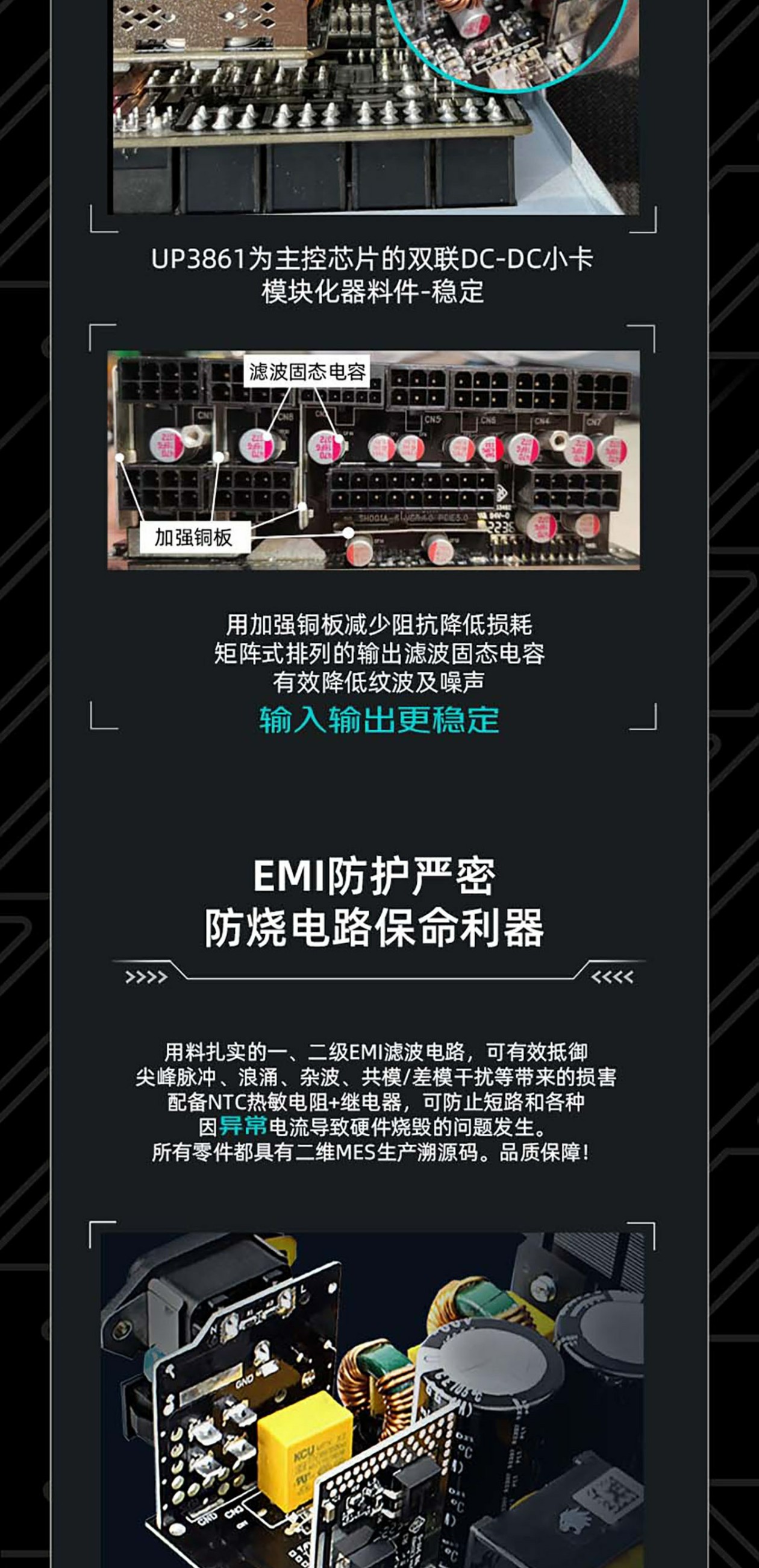 模组电源接口输入,矩阵式排列的输出滤波固态电容有效降低纹波及噪声,用加强铜板减少阻抗降低损耗。