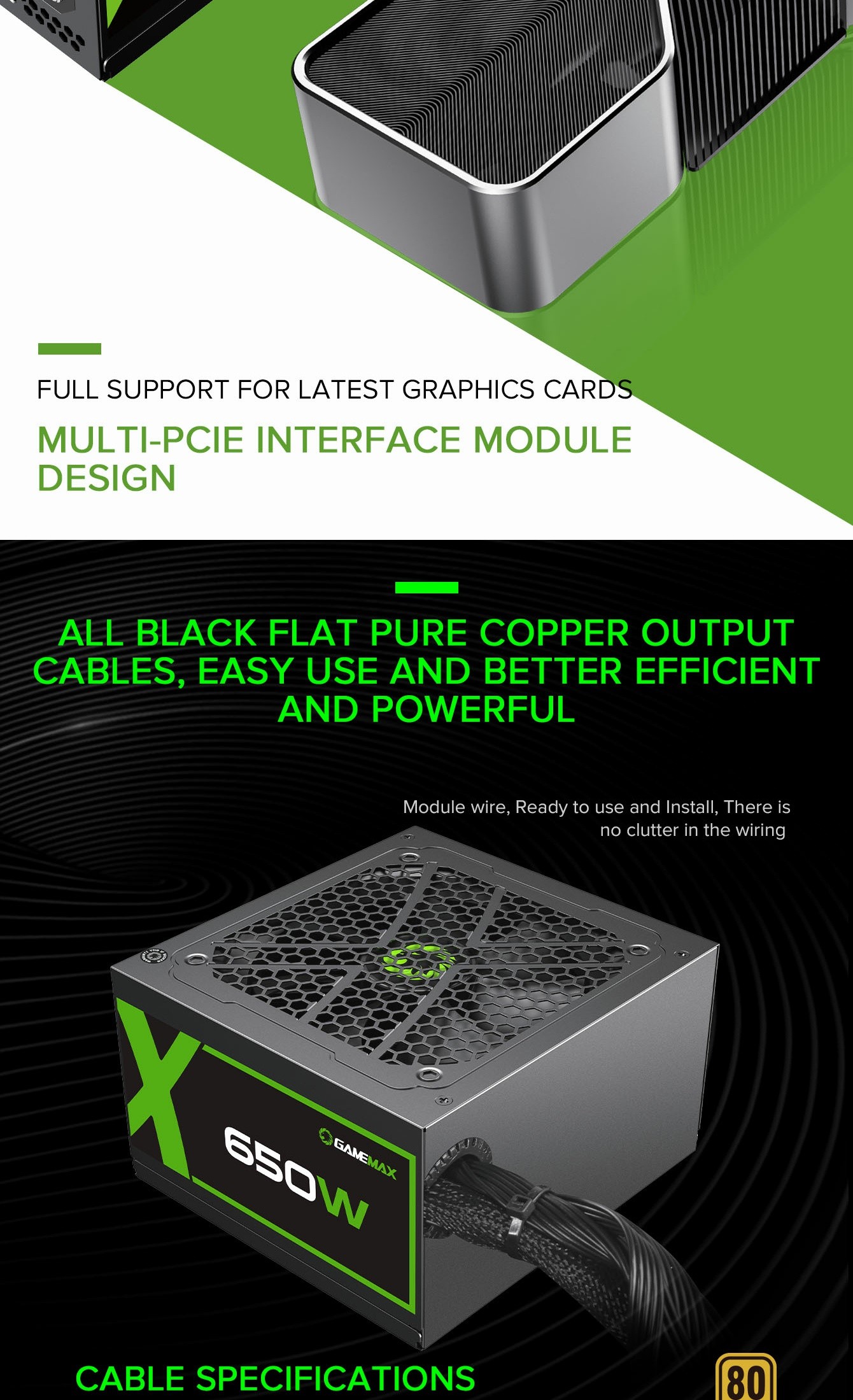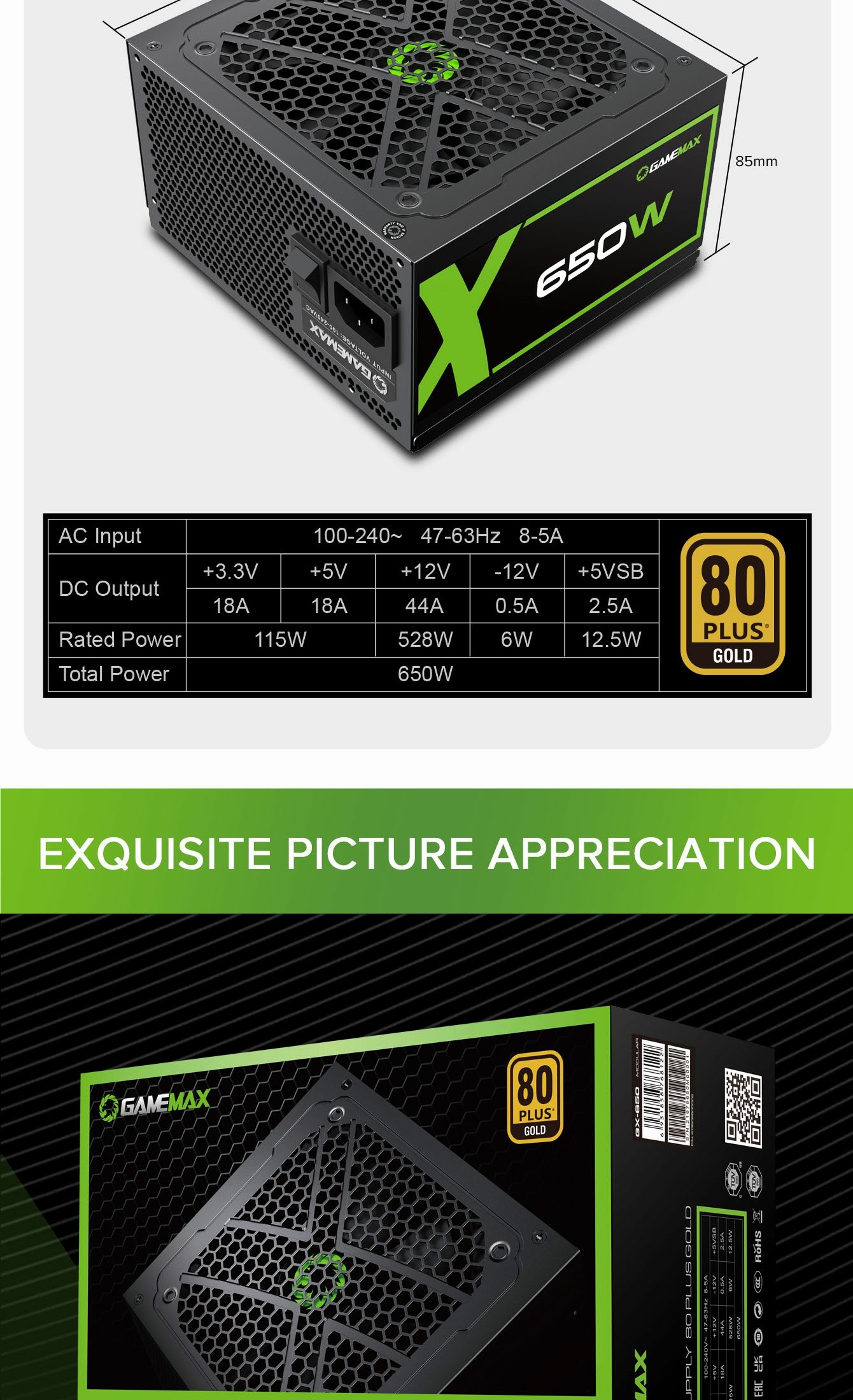 GameMax GX-650 80+ Gold 金牌电源,白金效率金牌认证、LLC 和 DC-DC 电路设计规范标准,经典效率超过 92%,内部采用无线电缆技术。