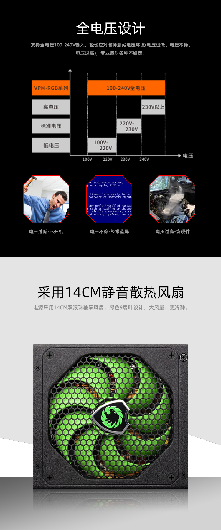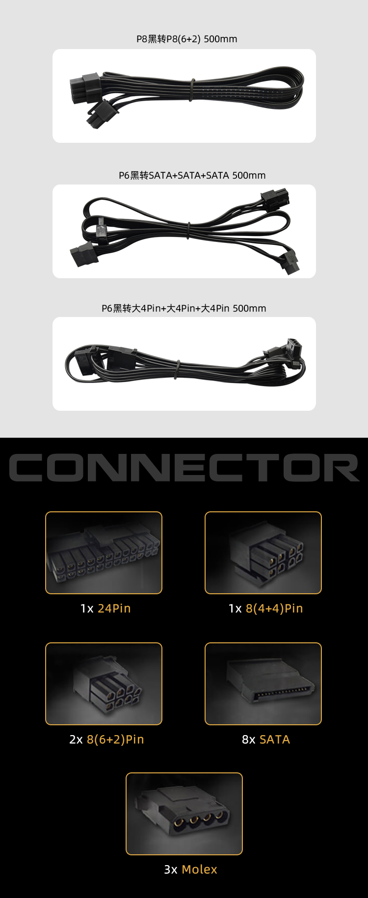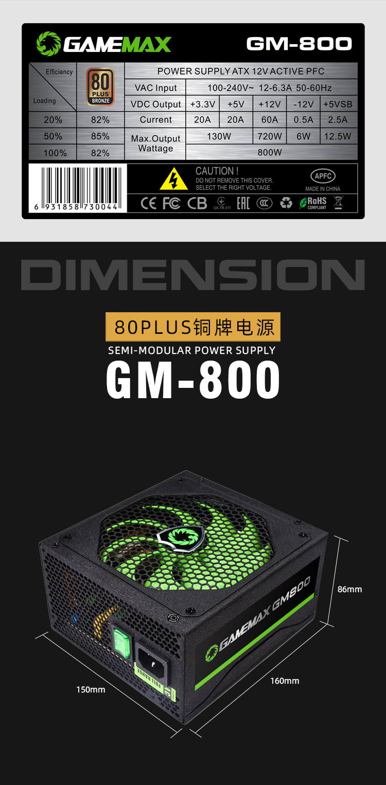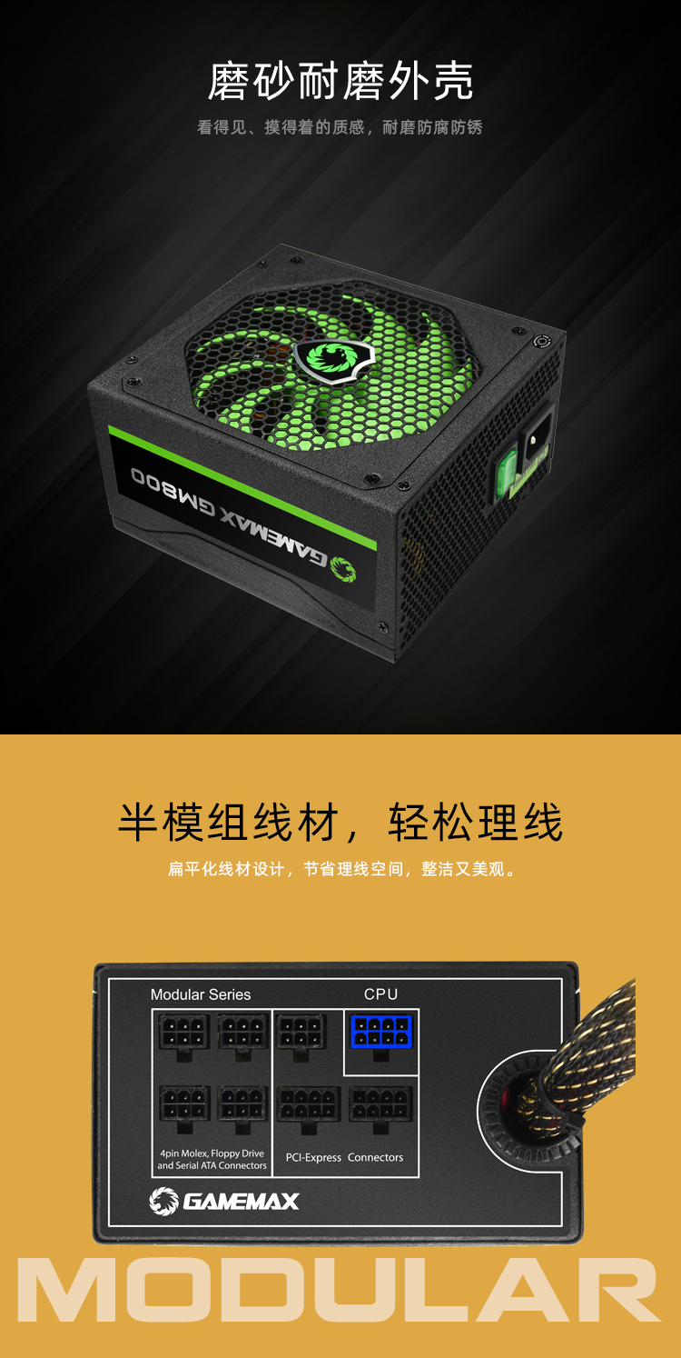 GameMax游戏帝国GM 系列电源,采用高效80+APFC电路铜牌设计,输出端口为半模组,模组化线材允许您仅连接系统需要的电缆。 更少的电缆使电脑机箱内部更整洁,并且在您的机箱内有更好的气流。并GM系列电源 具有多重保护设计,输出高效率,12V大电流升级版,为电脑运行提供耐用性和对您下一个系统构建的完全信心。