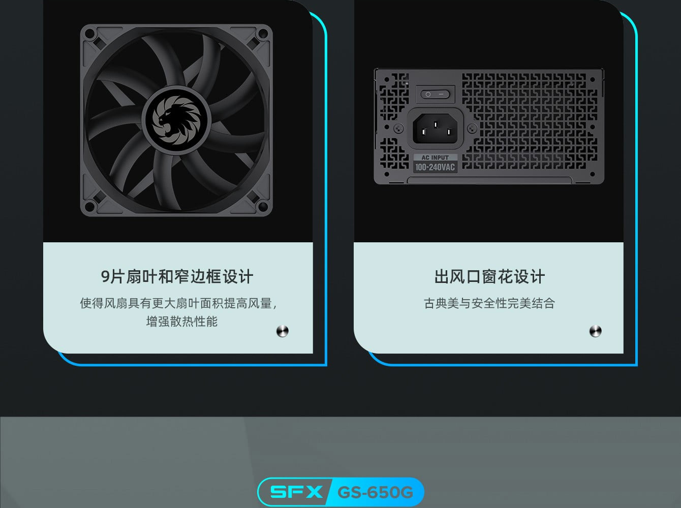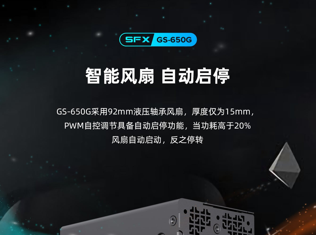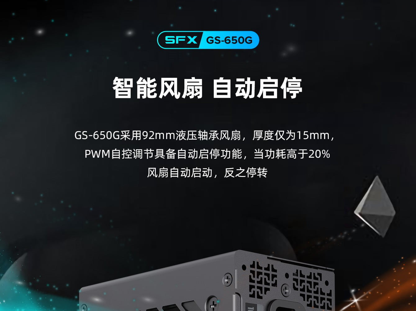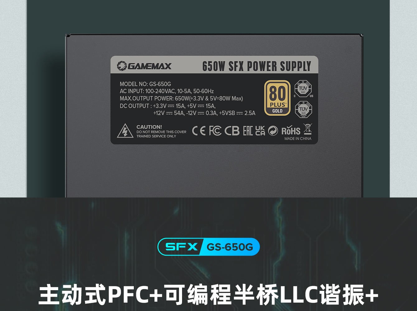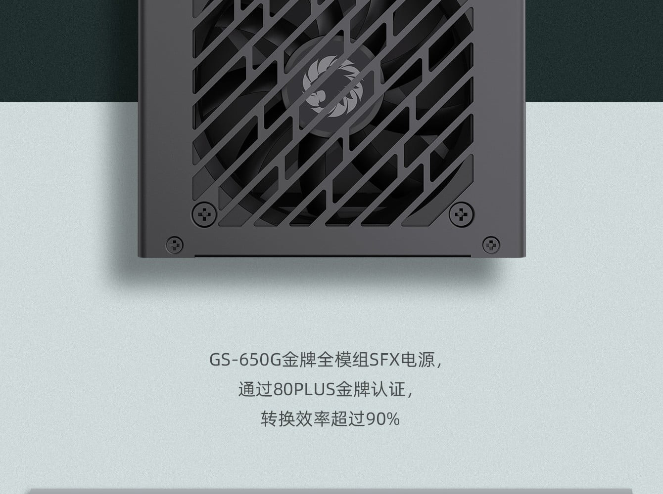 为您的个性机箱提供小型电源。打造专属的电脑系统 1、GameMax SFX系列电源为SFX小尺寸标准带来传奇般的性能和可靠性。 2、它们具有全尺寸高性能电源所具备的功能,符合80 PLUS的效率、优越的电压调节以及智能风扇控制器,以提高可靠性。 3、GameMax的新系列GS-650应用广泛,额定650W SFX小电源功能强大,占用空间小。这是一个标准SFX单元 4、GS-650随包装带SFX至ATX适配器支架,这使得电源不仅可以安装在SFX外形尺寸机箱中,还可以安装在标准ATX机箱中, 5、如果用户希望为PC机箱内的气流保留更多空间。GameMax混合风扇控制始终能够根据需要优化冷却。
