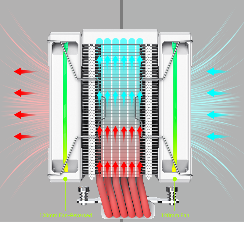 High-Performance Dual Fan Tower-Equipped with 6 x 6mm heatpipes and dual 120mm fans for powerful, efficient heat dissipation.