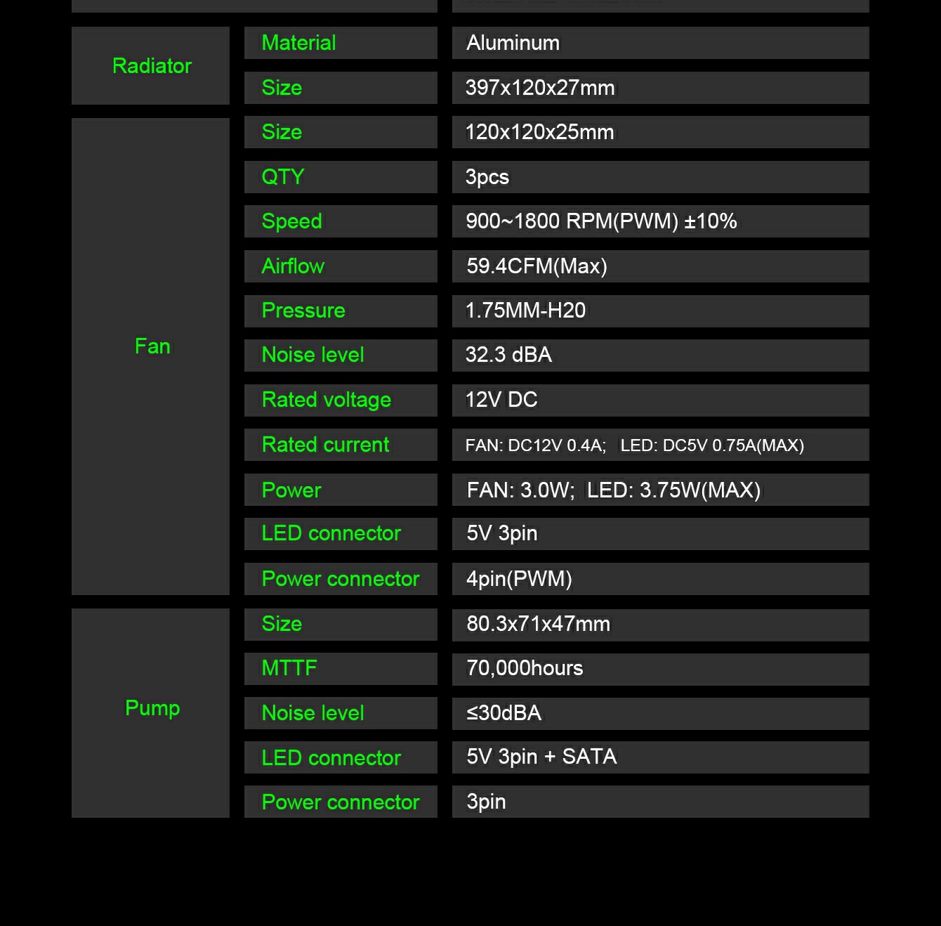 | Radiator | Dimentions/mm | 397*120*27 (53 incl. Fan) |