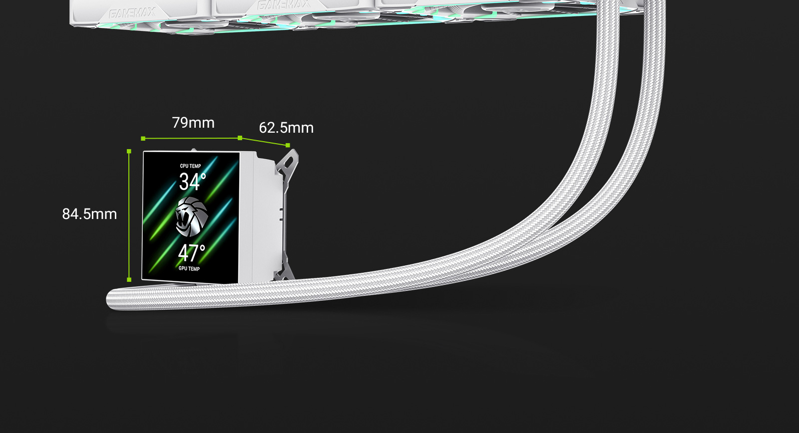 GAMEMAX HAILSTORM 360 High-Performance CPU Cooler - Modular LCD Screen, Multi-Platform Compatible• 3.95 inch 480×480 display previously seen ,offering real-time system stats and exclusive GAMEMAX themes.• Screen rotates and detaches easily for flexible placement and optimized viewing in any case layout.• 24 ARGB LEDs form the iconic claw mark design for bold lighting that matches your chassis lineup,matching GAMEMAX chassis family style.• Built-in fan spins up to 2200 RPM, delivering 66.89 CFM airflow for stable thermal performance in demanding scenarios.• Reinforced fan motor with thickened magnetic strips and more magnets ensures smoother, quieter operation and improved durability.• Full compatibility with Intel/AMD platforms.