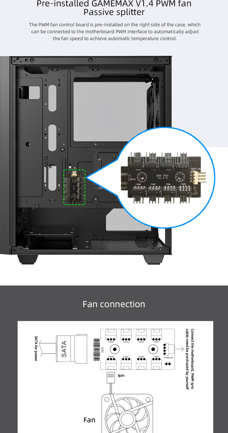 • 1x PWM HUB zur Steuerung von bis zu 5 Lüftern für automatische Geschwindigkeitsanpassung.