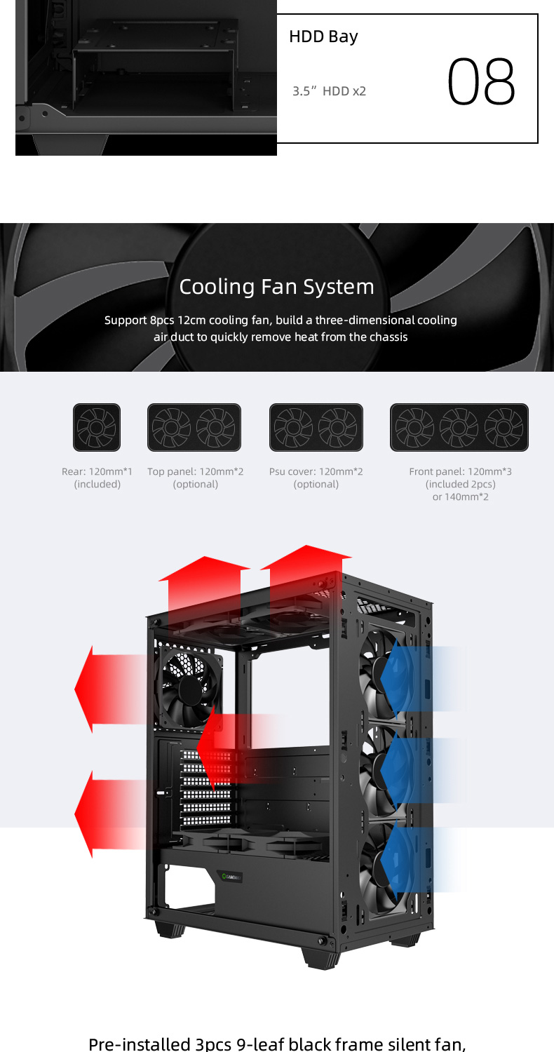 | Cooling Fan Support | Front | 2x120mm Black Fan( Included) |