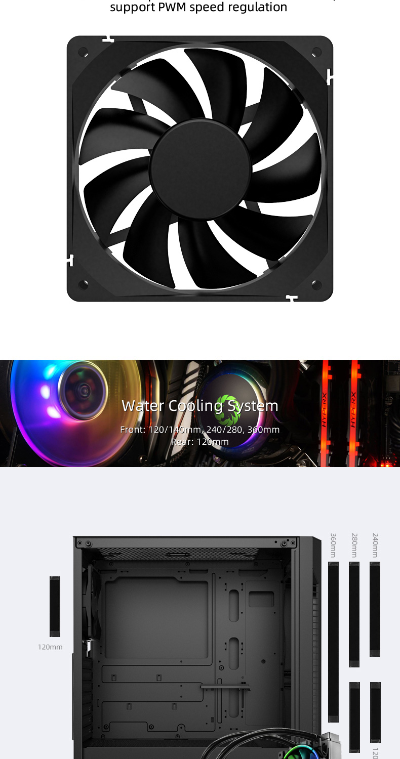 | Water Cooling Support (Radiator Size) | Front | 120mm, 140mm,240mm,280mm |