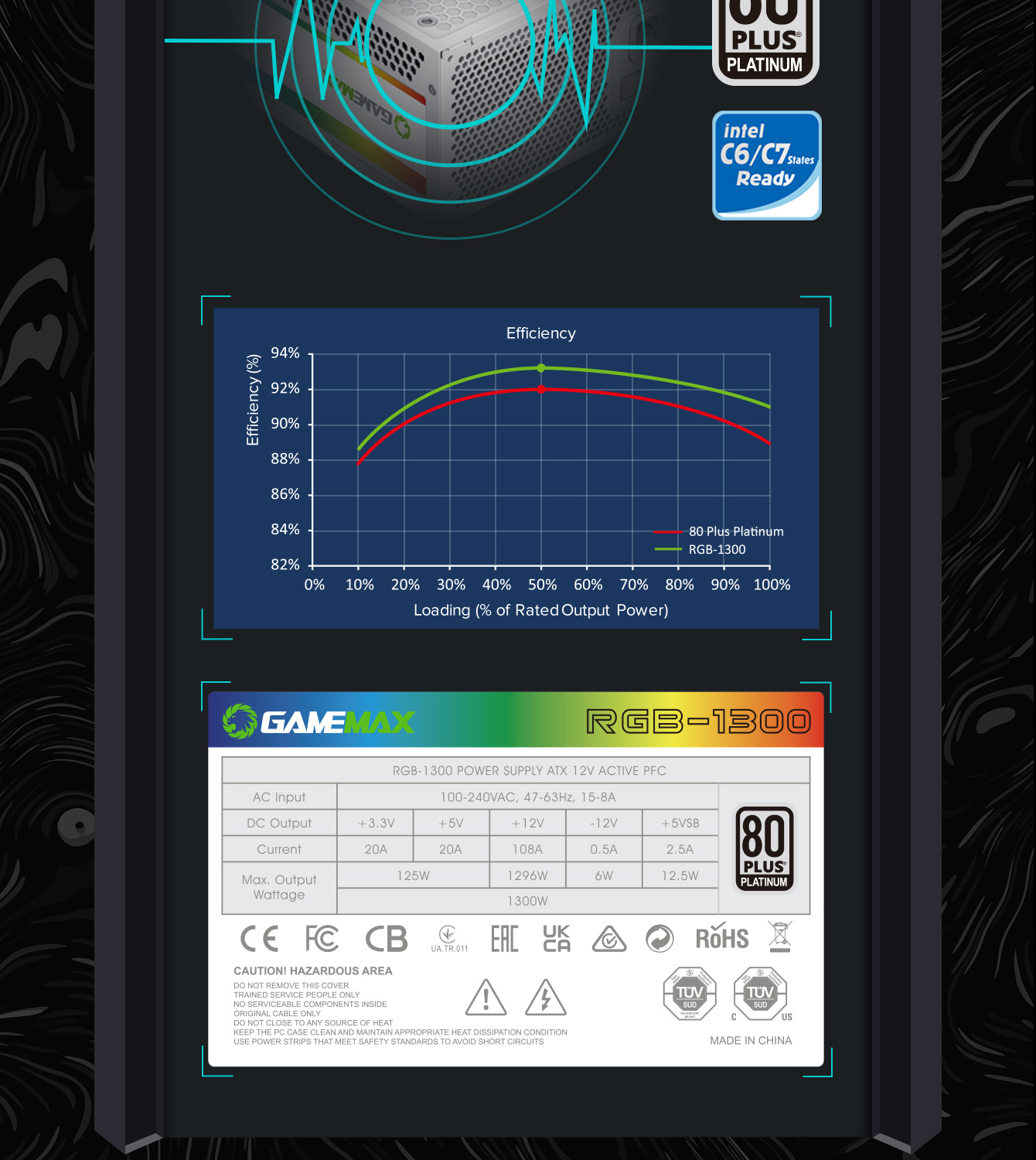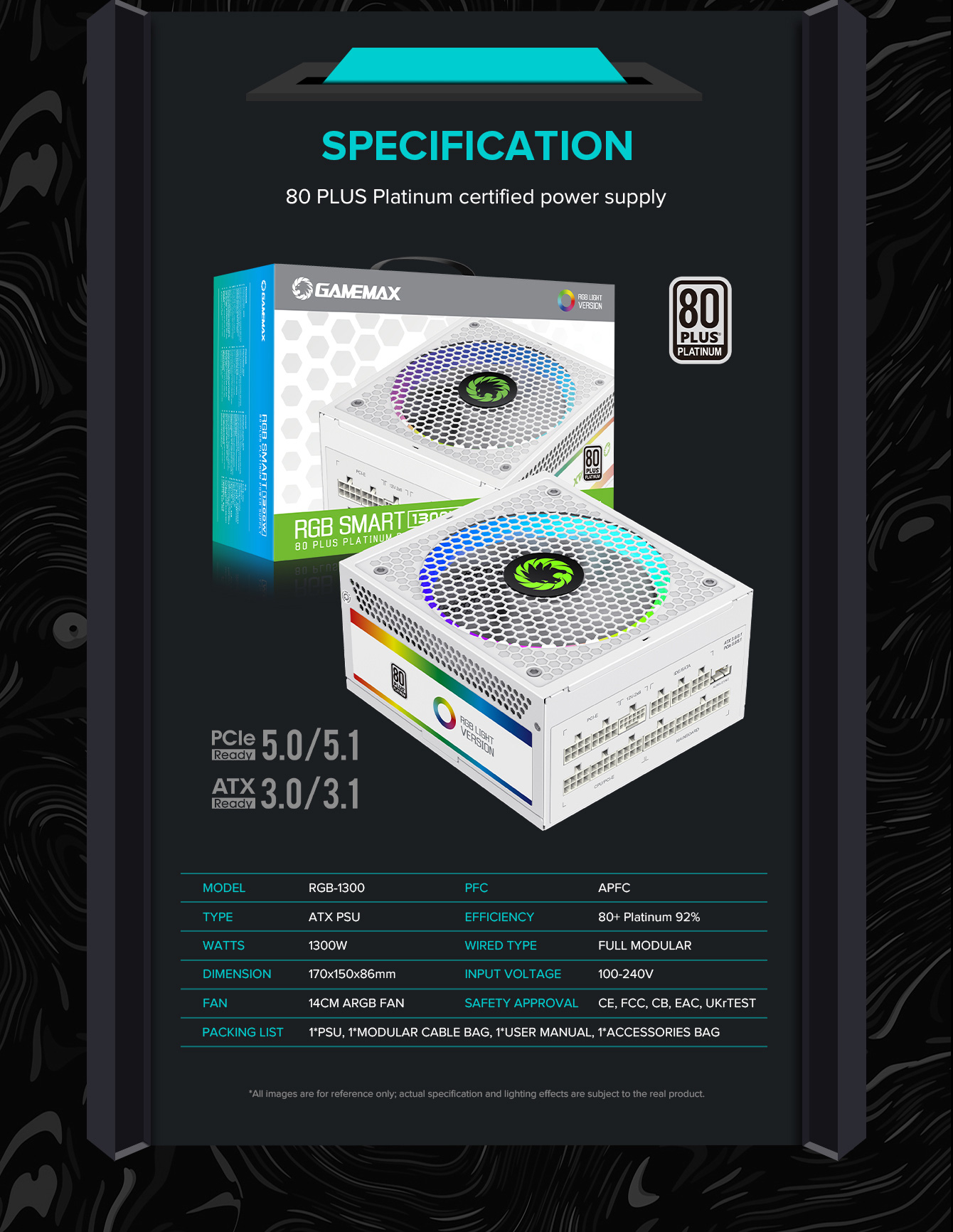 GameMax 1300W PC Netzteil Rechner – 80+ Platinum, ARGB, Vollmodular, Kompatibel mit ATX 3.1/PCIe 5.1• 1300W Leistung: Vollmodular, 80+ Platinum zertifiziert, 92 % Effizienz