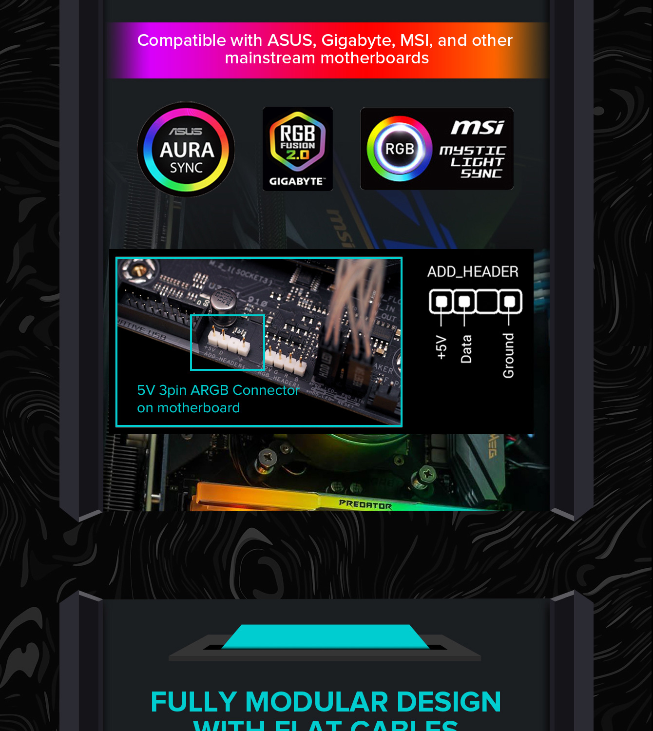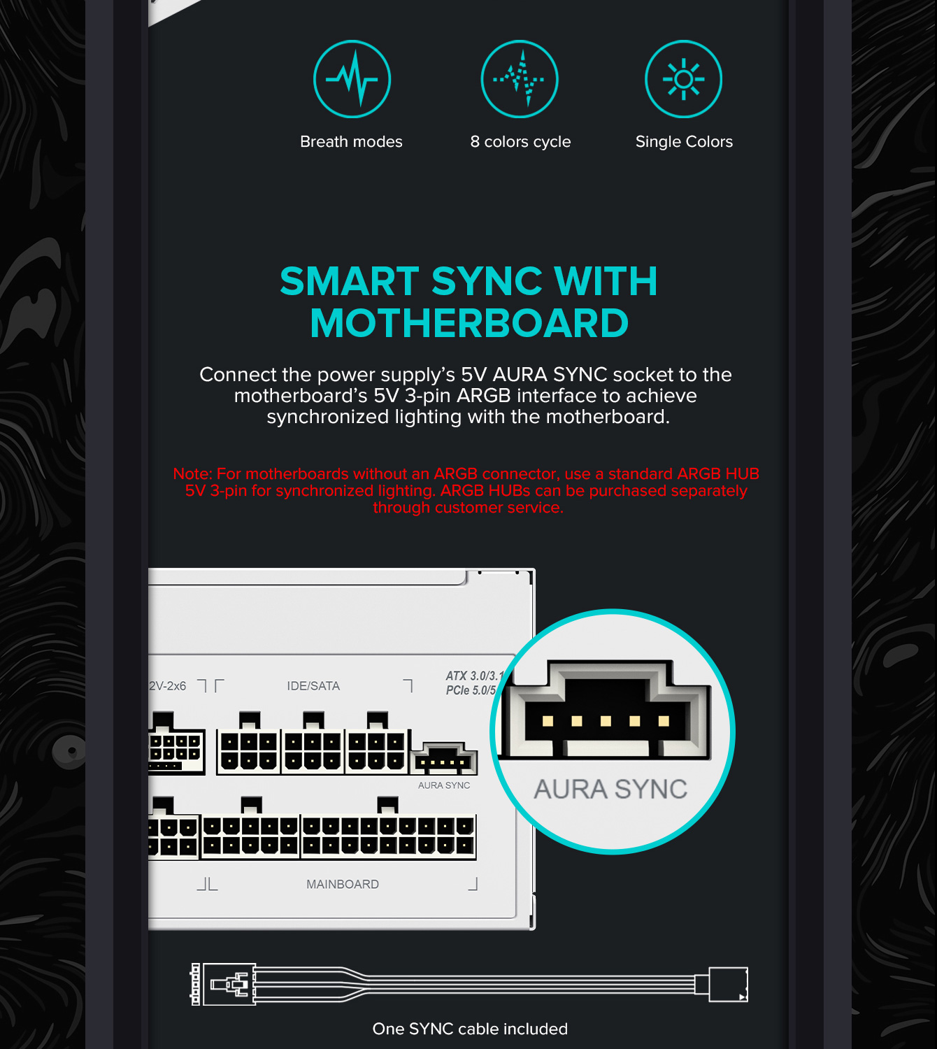 | Aura SYNC Mode: | Access external ARGB HUB or 5V 3pin signal from motherboard |