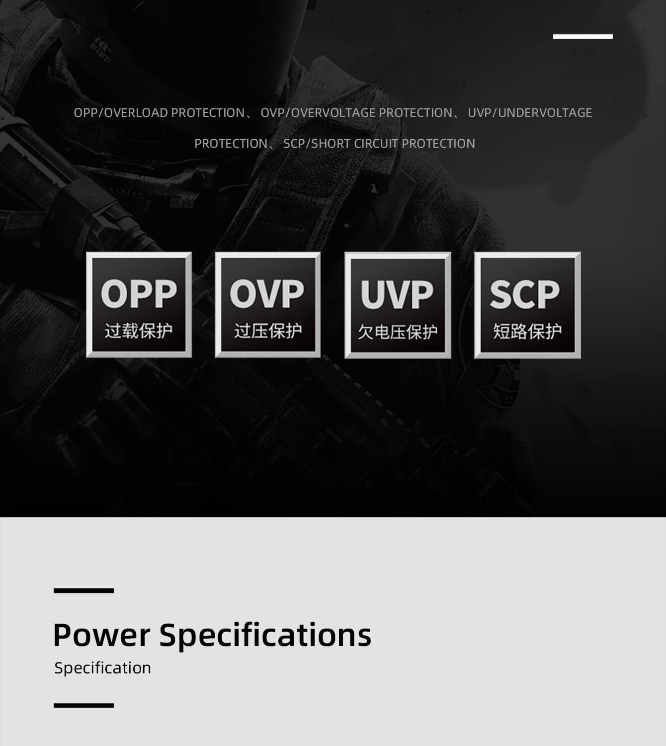 | Protection | OPP, OVP, UVP, OCP, OTP, SCP, SIP | |