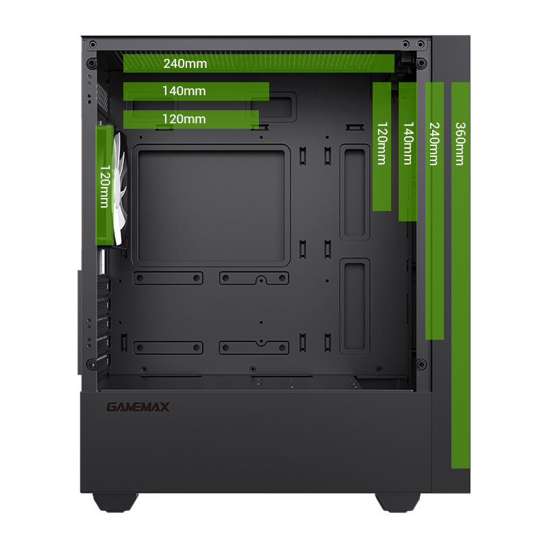 | Water Cooling Support (Radiator Size) | Front | 120mm, 140mm,240mm,280mm,360mm |