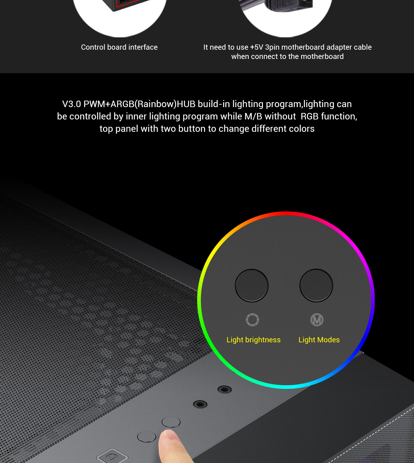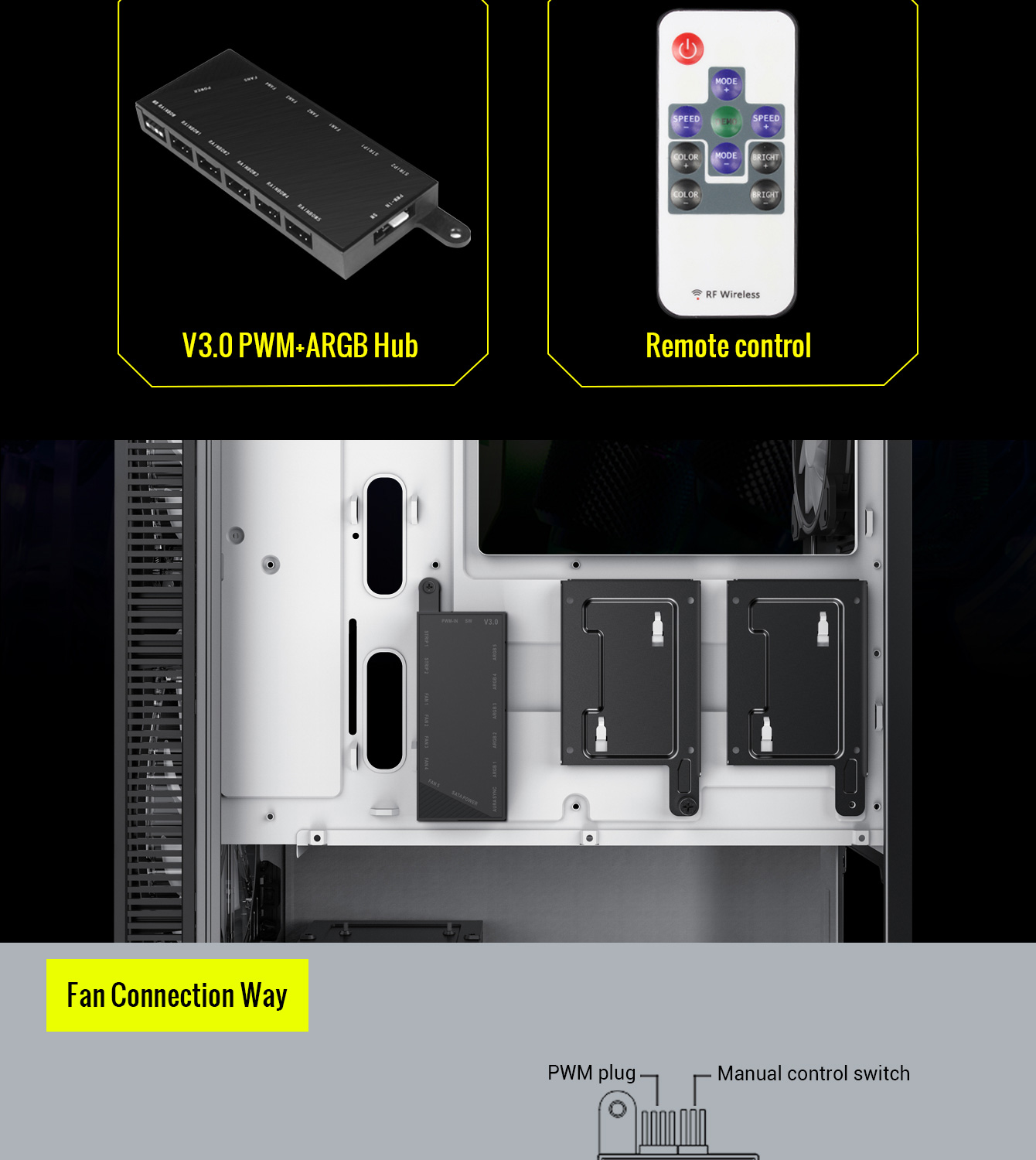 • You can connect all your fans to the pre-installed ARGB hub (both remote or manual control via top RGB switch) allowing for stunning lighting effects and an easily sync any further fans you choose to mount