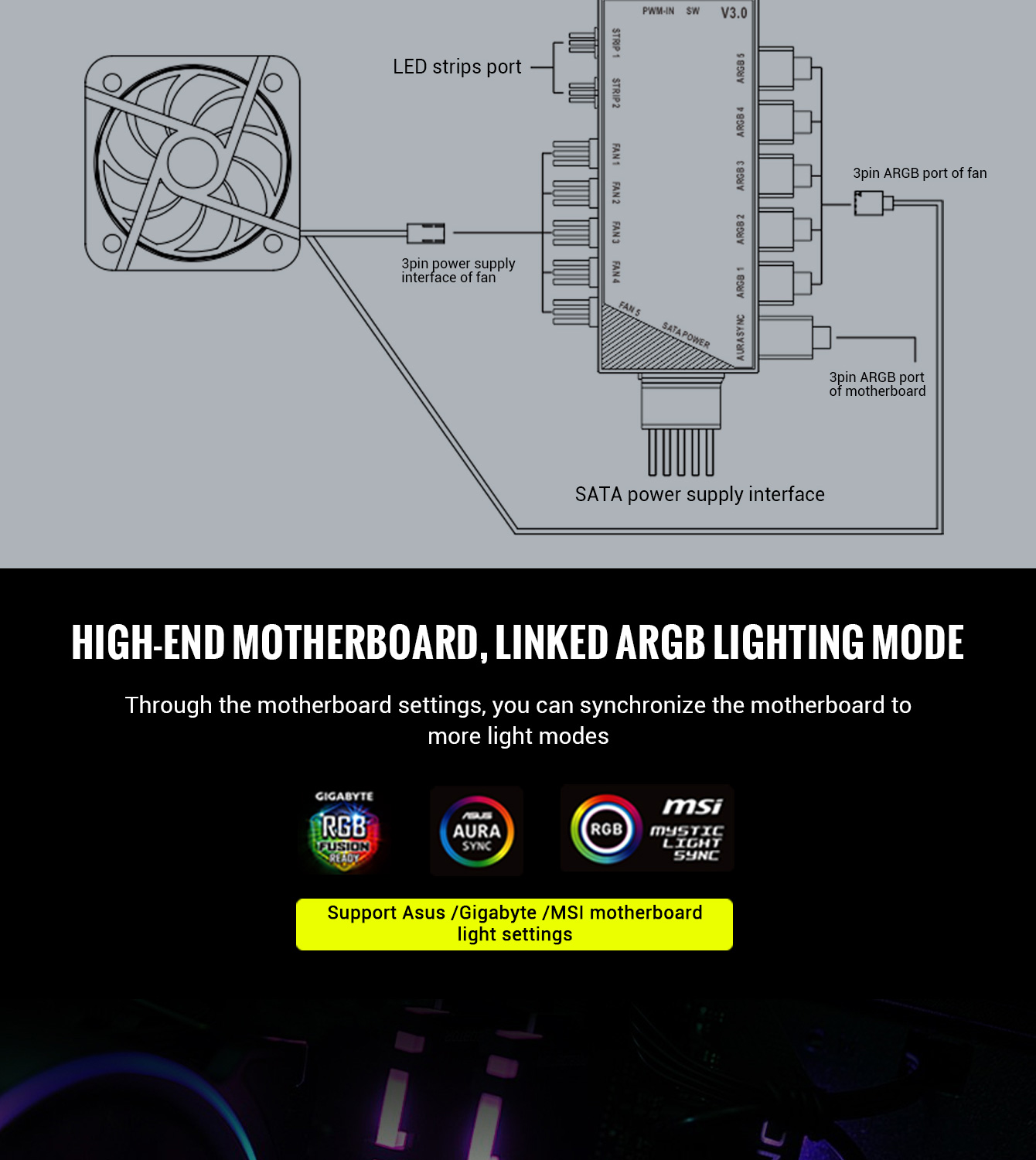 • Please note the hub can connect only Five fans + 2x ARGB strips.