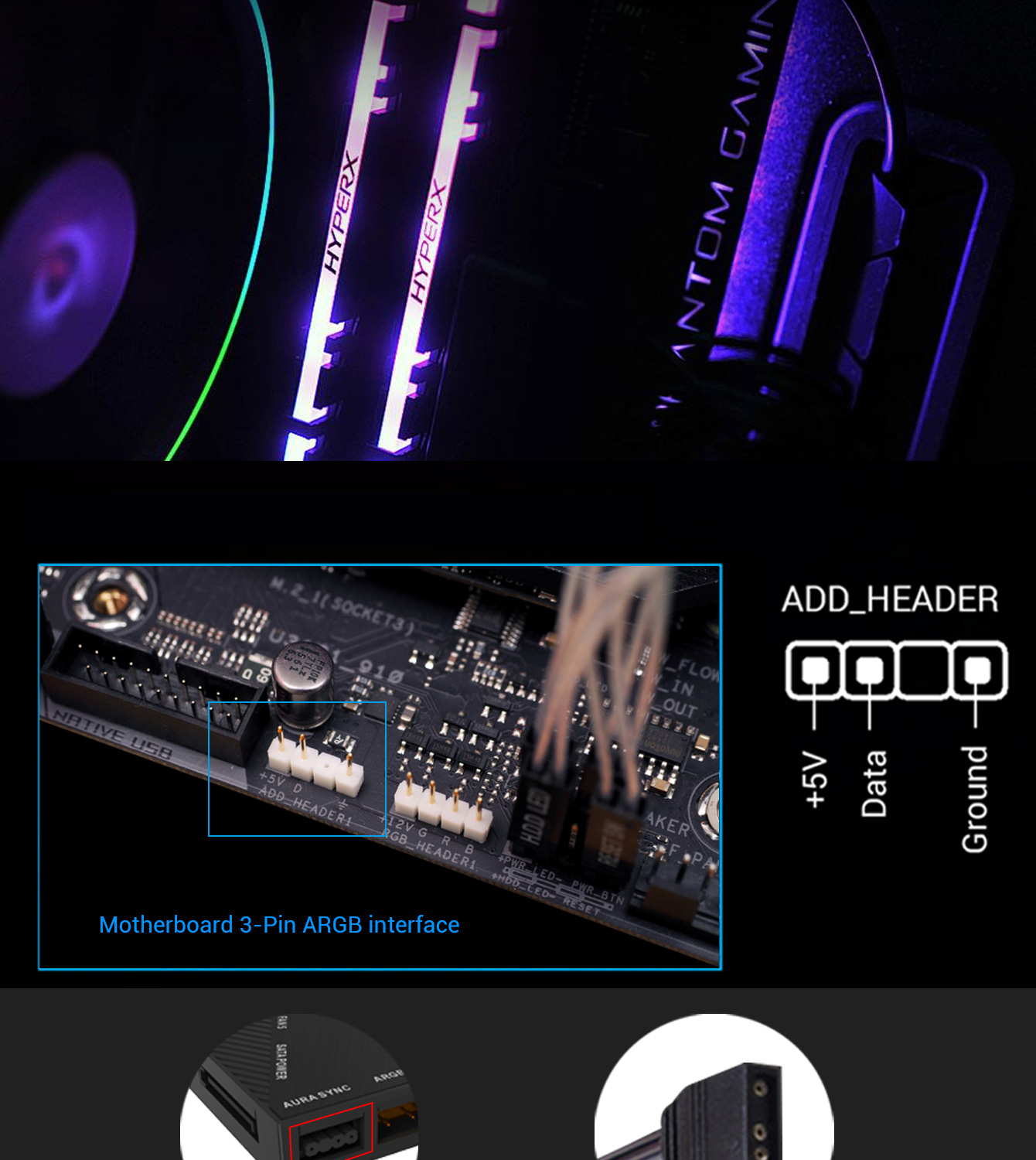 • You can also sync all fans to a compatible motherboard using the included 3 Pin AURA connectors