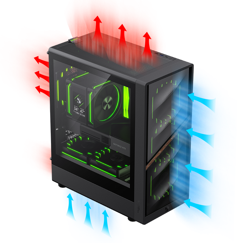 Superior Thermal Performance - High-airflow mesh front panel and vertical airflow layout ensure efficient heat dissipation during intense gaming and heavy workloads.