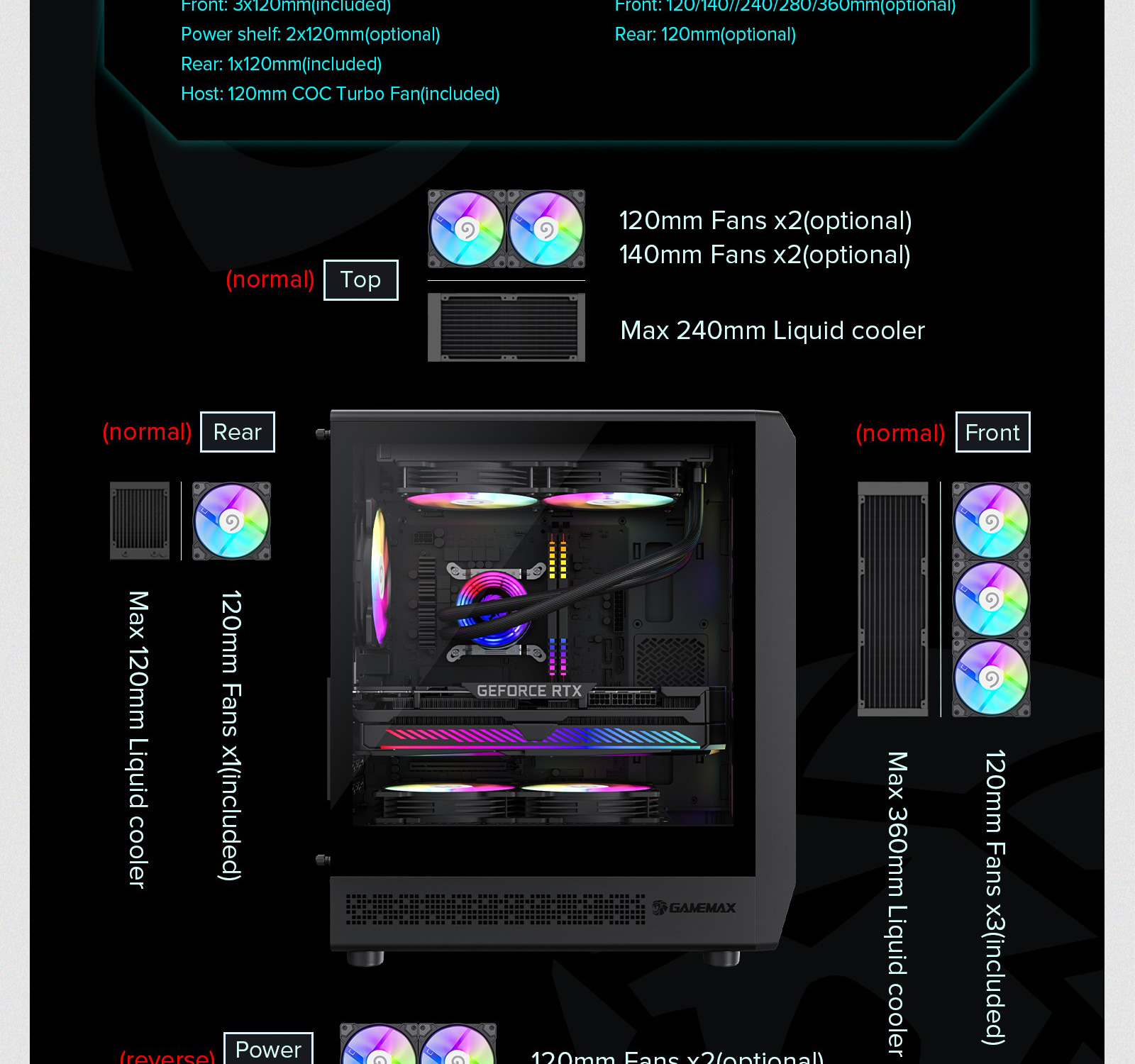 | Water Cooling Support (Radiator Size) | Front | 120mm, 140mm,240mm,280mm,360mm |
