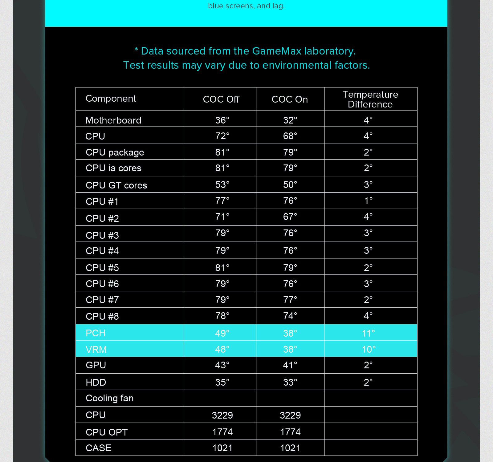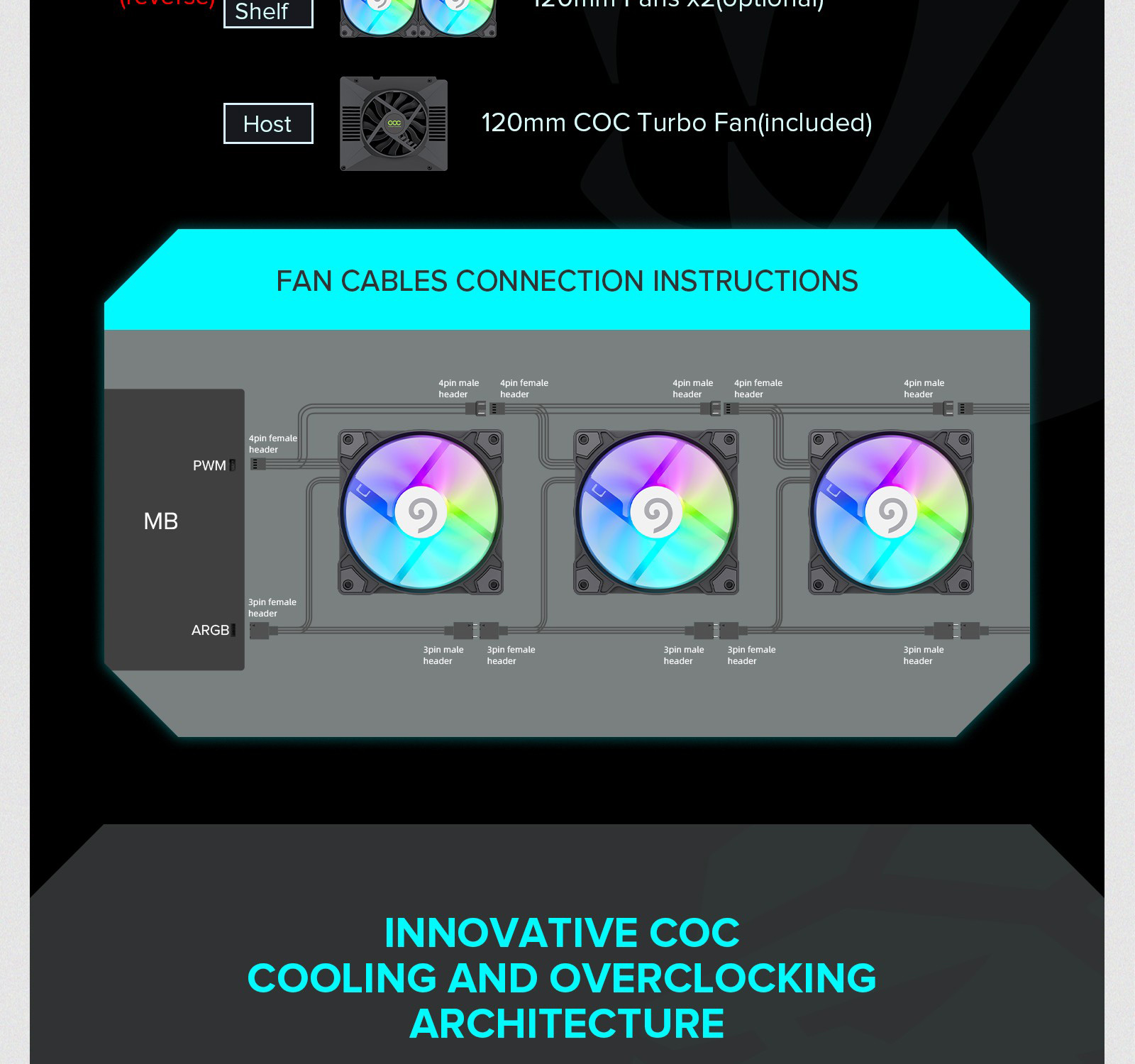 • Excelente Refrigeración - Acomoda hasta 9 ventiladores (5 ventiladores integrados, incluyendo un ventilador COC turbo) y radiadores de hasta 360mm para una refrigeración óptima.