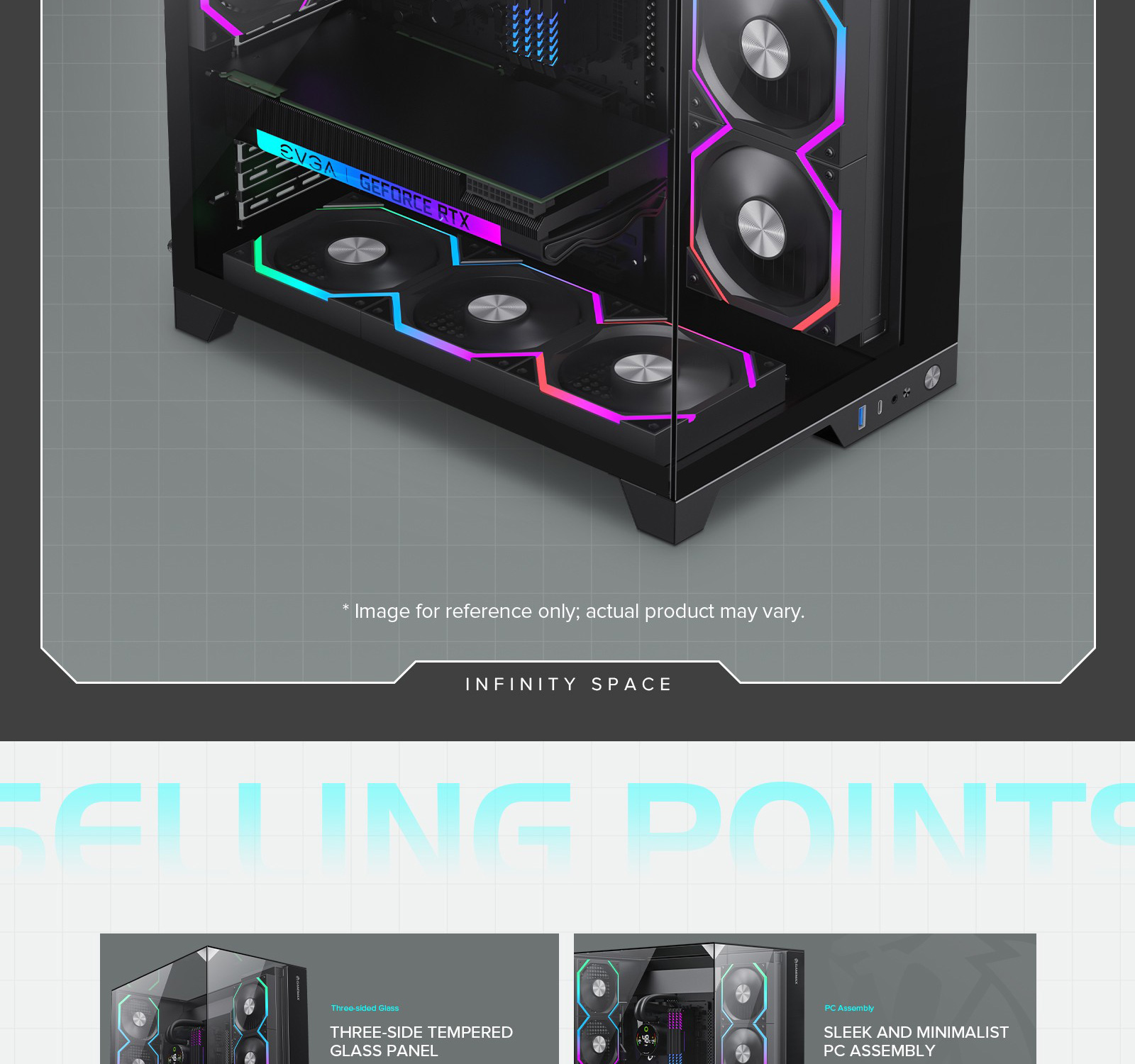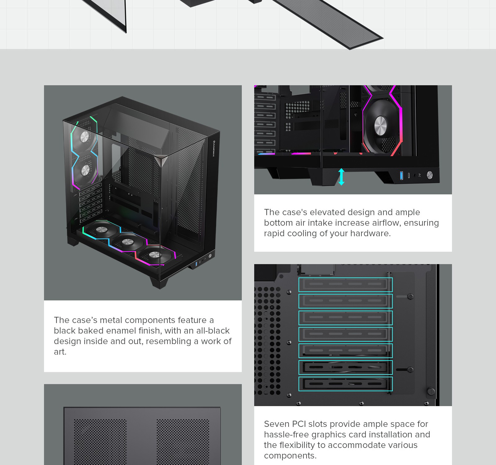 • Diseño de Visión Completa: Paneles de vidrio templado en tres lados para una visibilidad clara de la iluminación RGB y los componentes, creando un ambiente de juego espectacular.