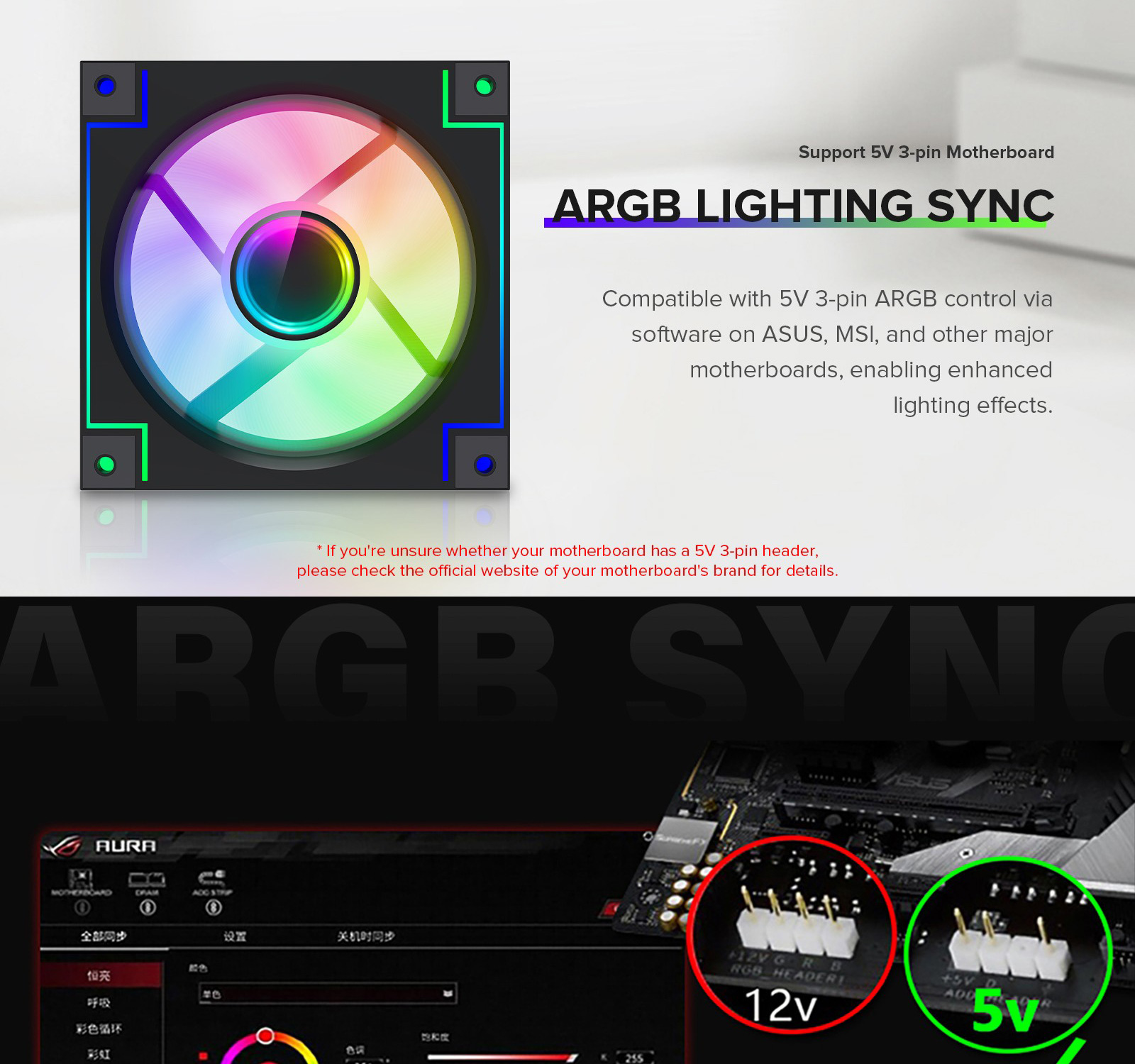 You also can turn on / off the fan light effect and switch the fan hub ARGB signal to the motherboard 5V ARGB port by AURA Sync Mode