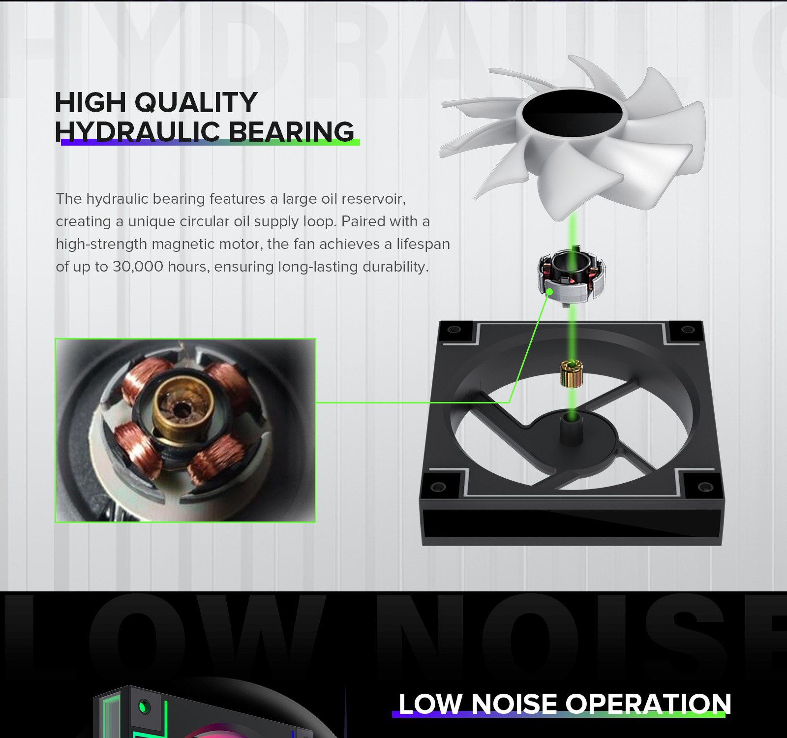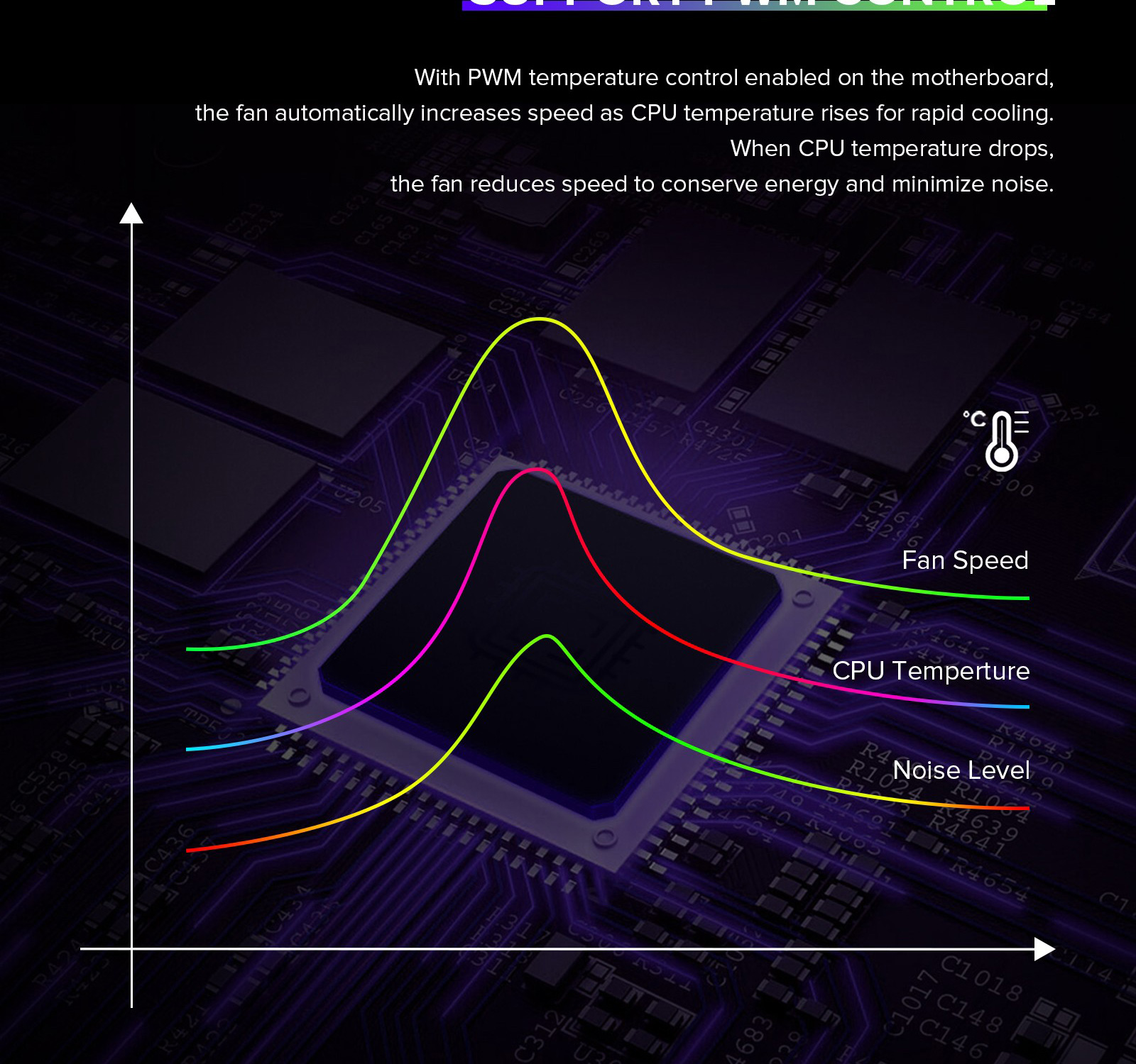 The intelligent temperature controls the speed at 800~1600±10% RPM, by linking to the motherboard PWM 4pin socket, so the fan speed auto controlled and keeps the fans quiet