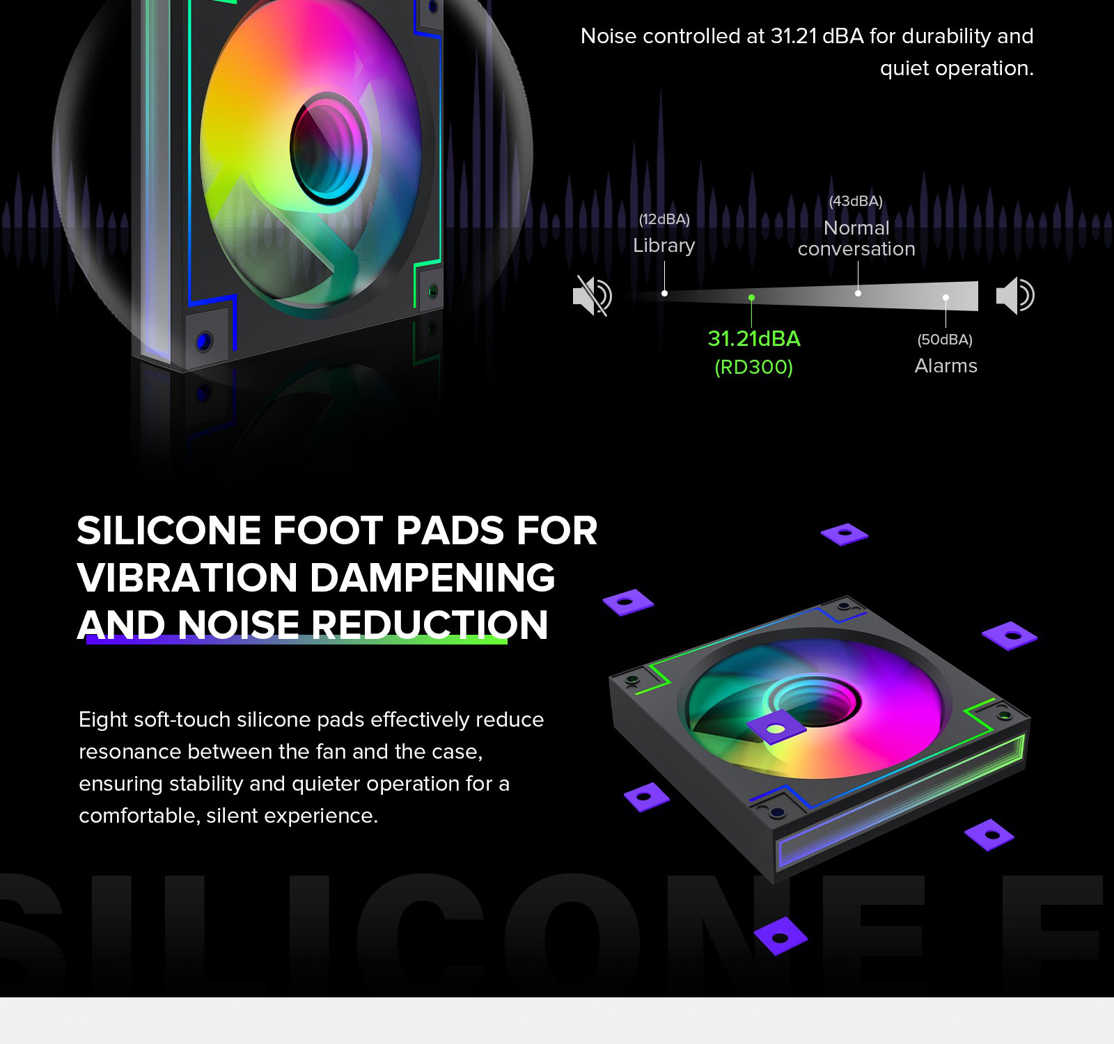 【Shockproof Design】The fan frame is fixed on both sides with 8 pieces of shock-absorbing rubber pads