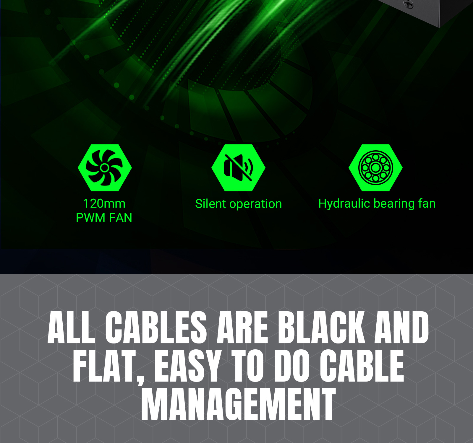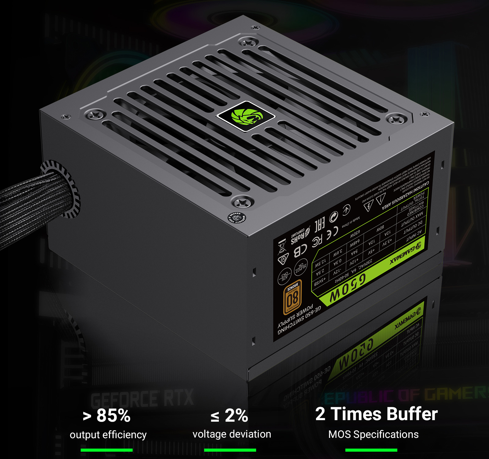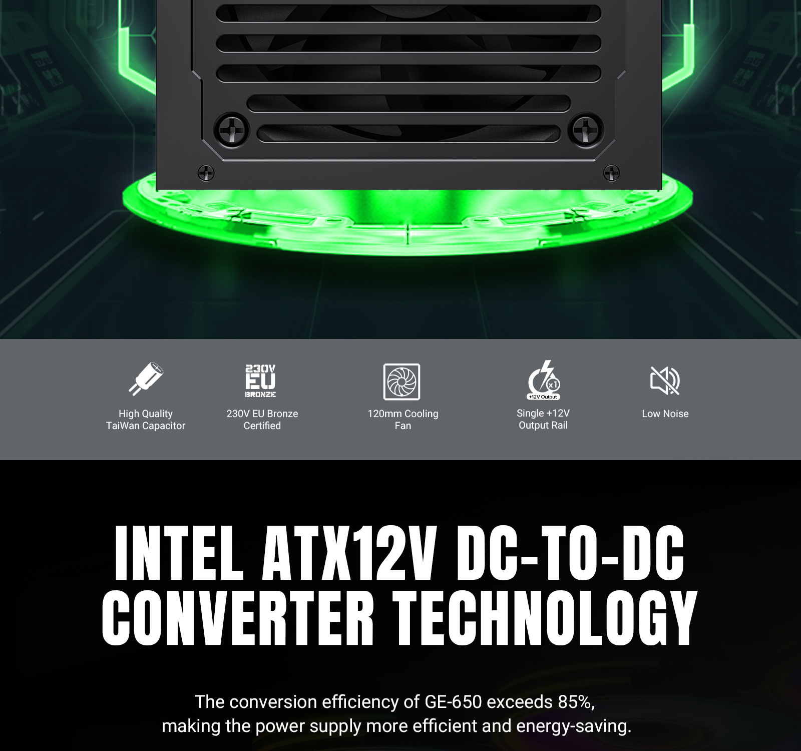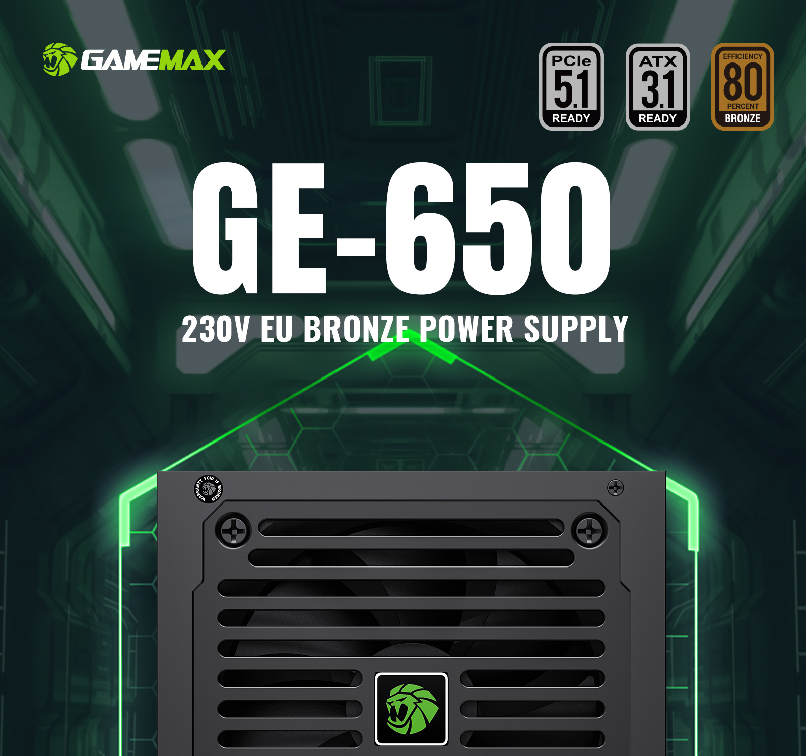 Gamemax GE range ECO 650W, ATX3.1 and PCIe5.1 Ready to Compatible! Both Performance and Practicality, Compact Cable Drawing, High Efficiency 85% Bronze Level, along with the Silent Fan by Smart Controlled.• Save Energy & Costs – 85% efficiency with APFC technology.• Stable & Powerful – Single +12V rail for high-performance CPUs/GPUs.• Clean & Reliable Power – DC-DC module ensures stable voltage and low noise.• Total Protection – Built-in OVP, UVP, OCP, SCP, OTP, OPP safeguards your system.• Includes 16pin 12VHPWR GPU Power Connector(12V-2x6), PCIe 5.1 Ready, For the latest GPUs.