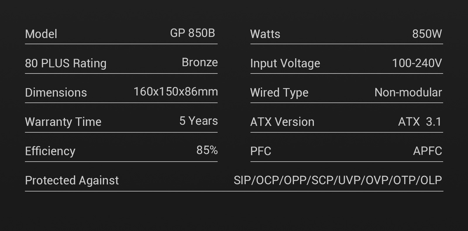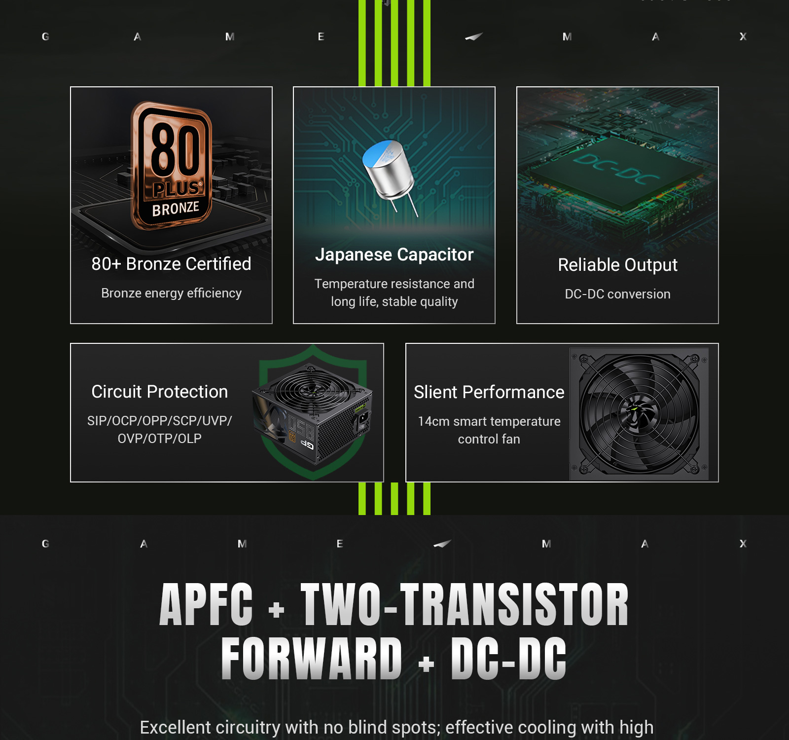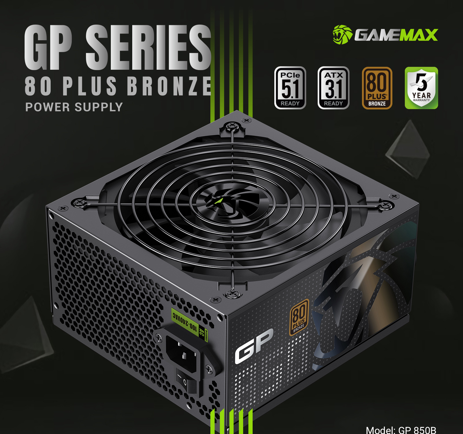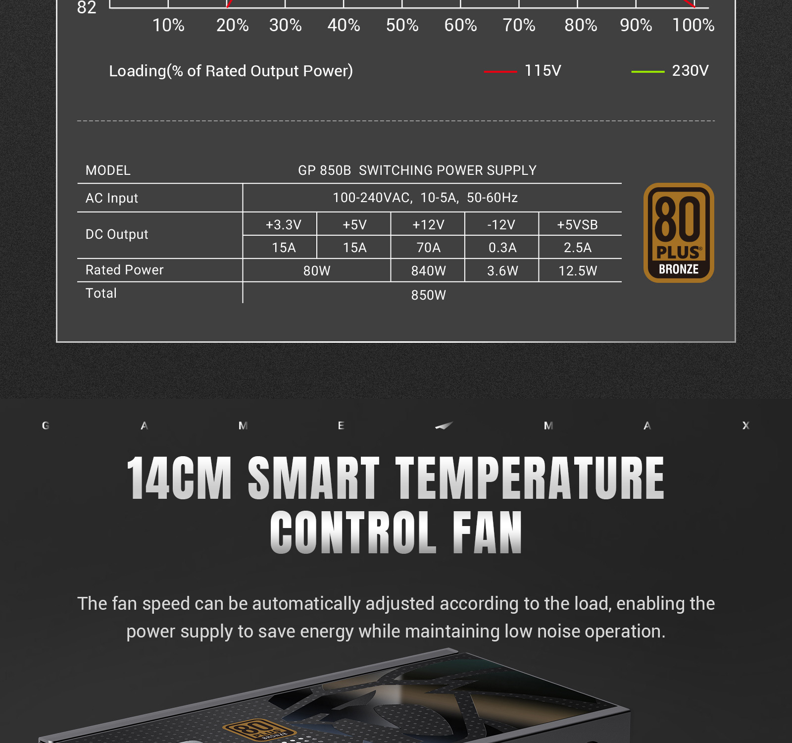 GAMEMAX GP 850B 80+ Bronze ATX3.1 PCIe5.1 Ultra-Stable Power Supply with Dual DC-DC Control, Smart Fan and Premium Cooling.