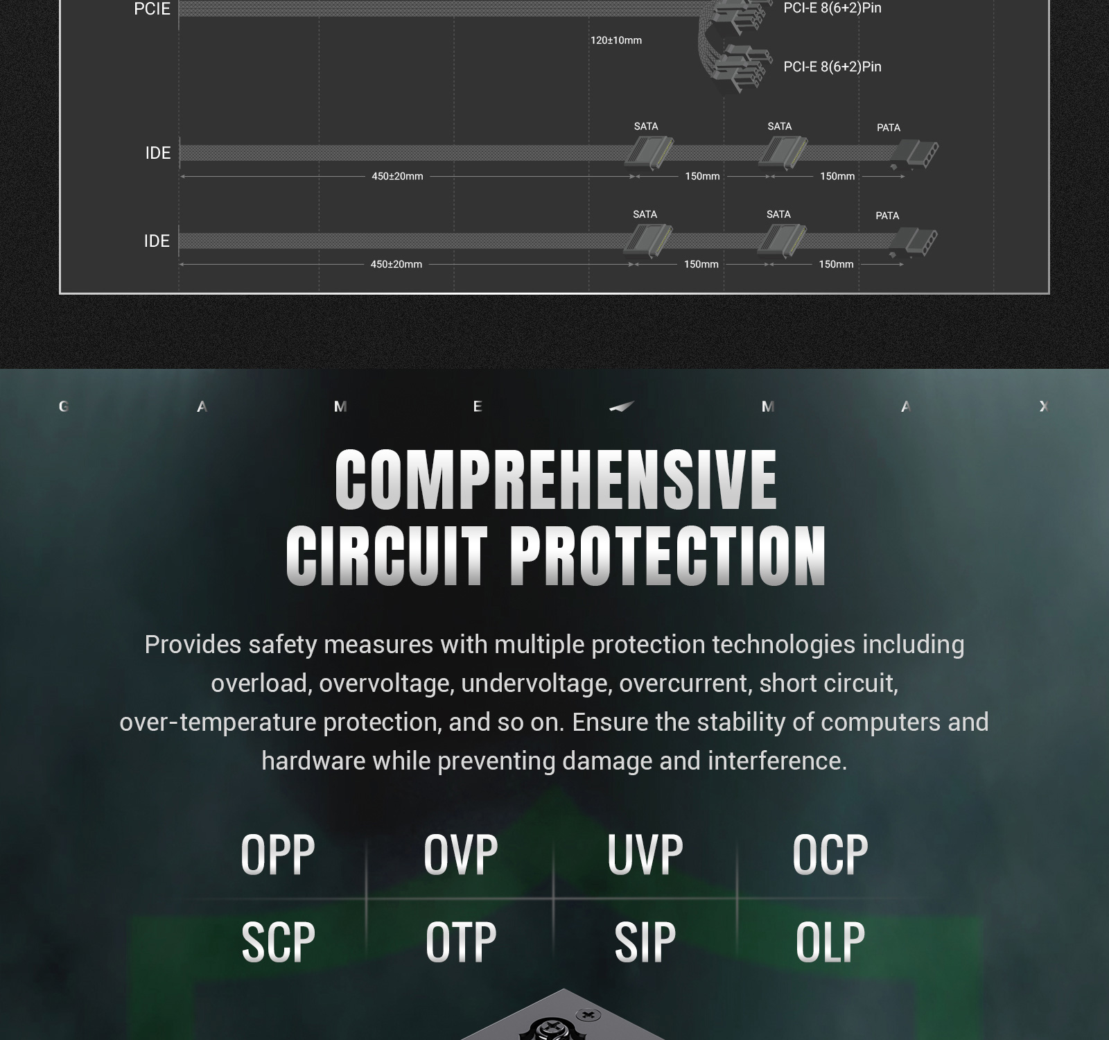 | Protection: | OPP / OVP/ UVP / OCP/ SCP / OTP / SIP / OLP / NLO |