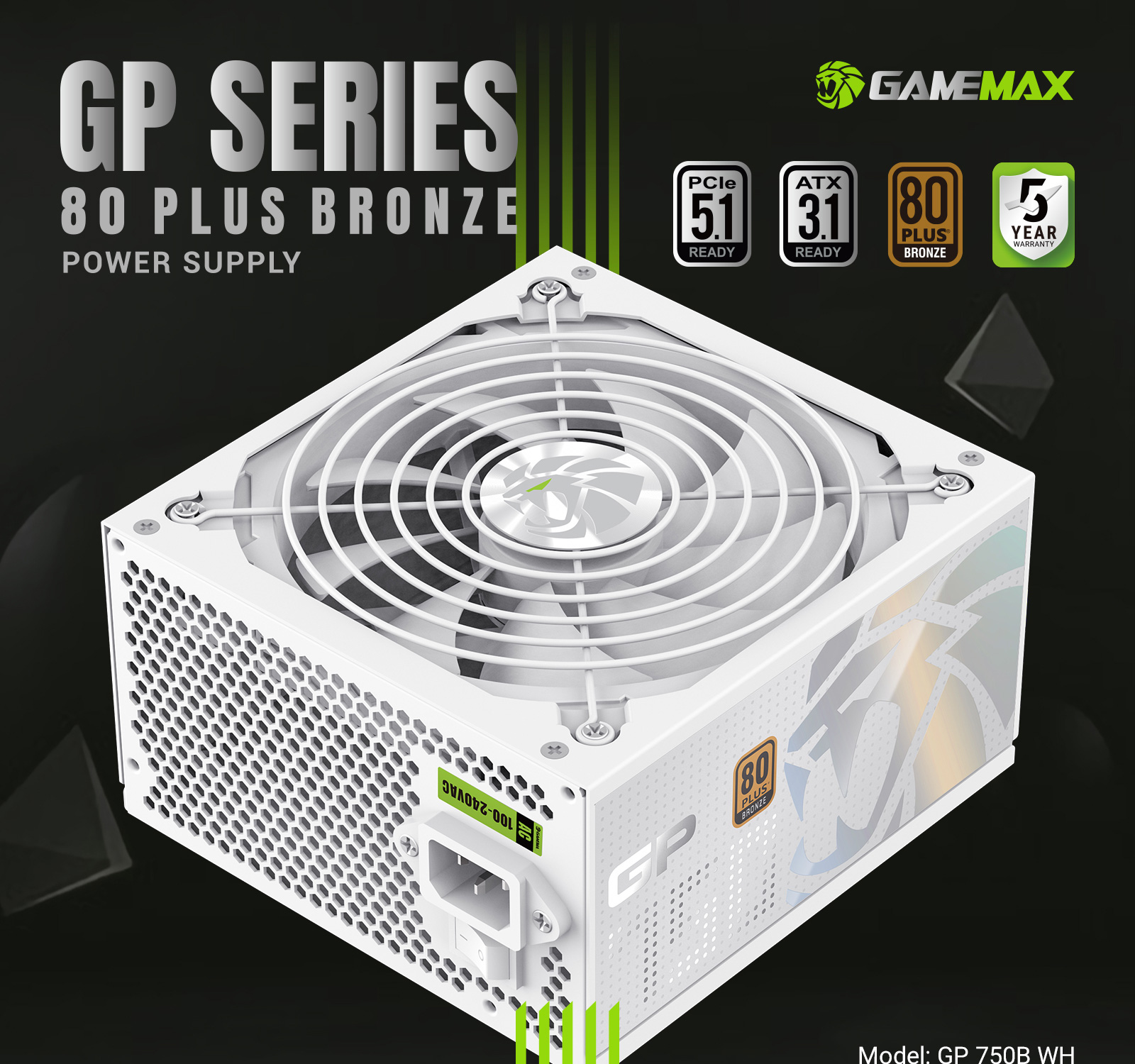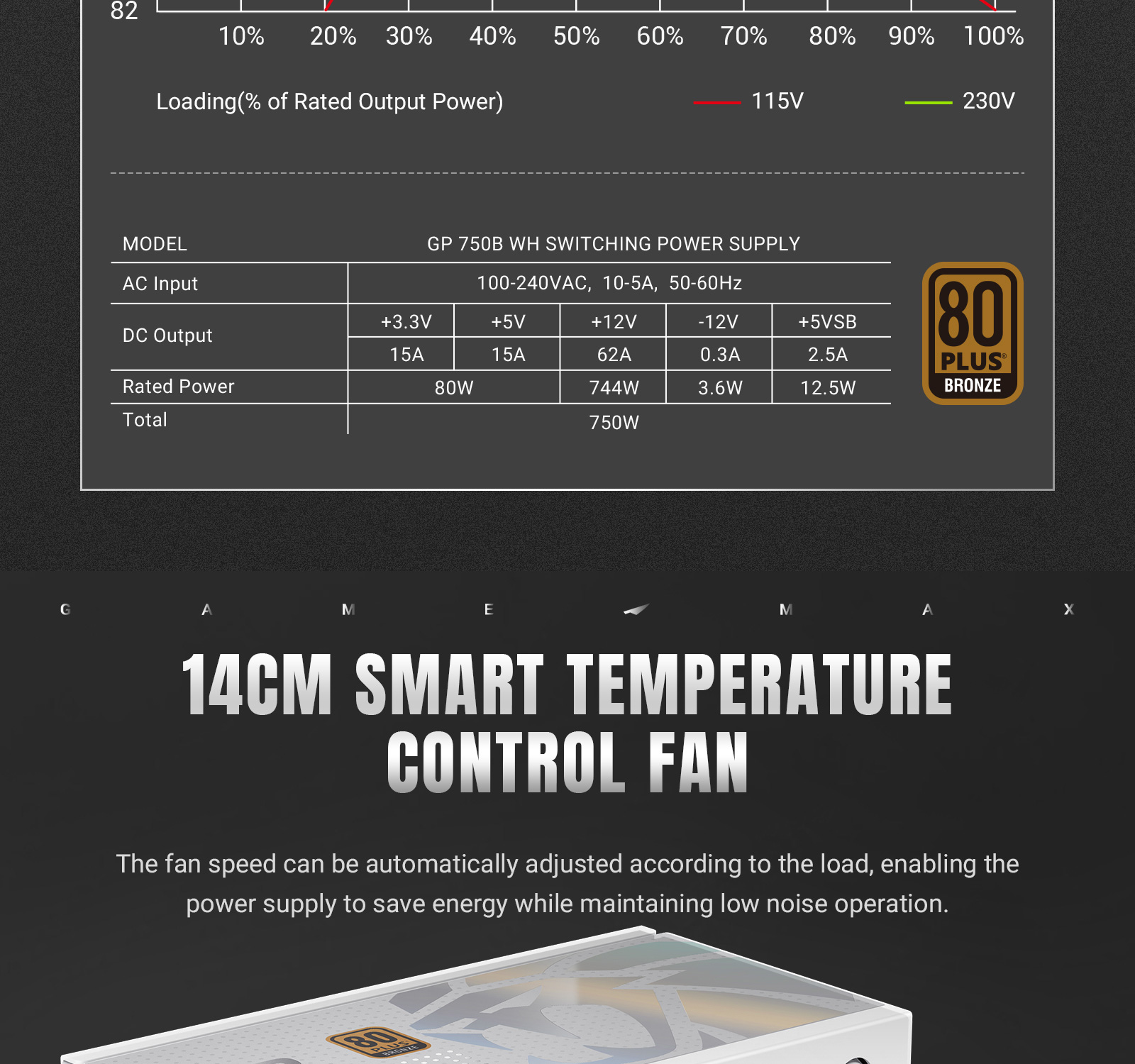 GAMEMAX GP 750B 80+ Bronze ATX3.1 PCIe5.1 Ultra-Stable Power Supply with Dual DC-DC Control, Smart Fan and Premium Cooling.