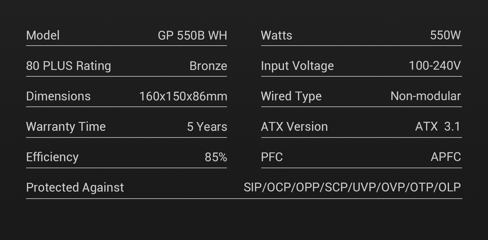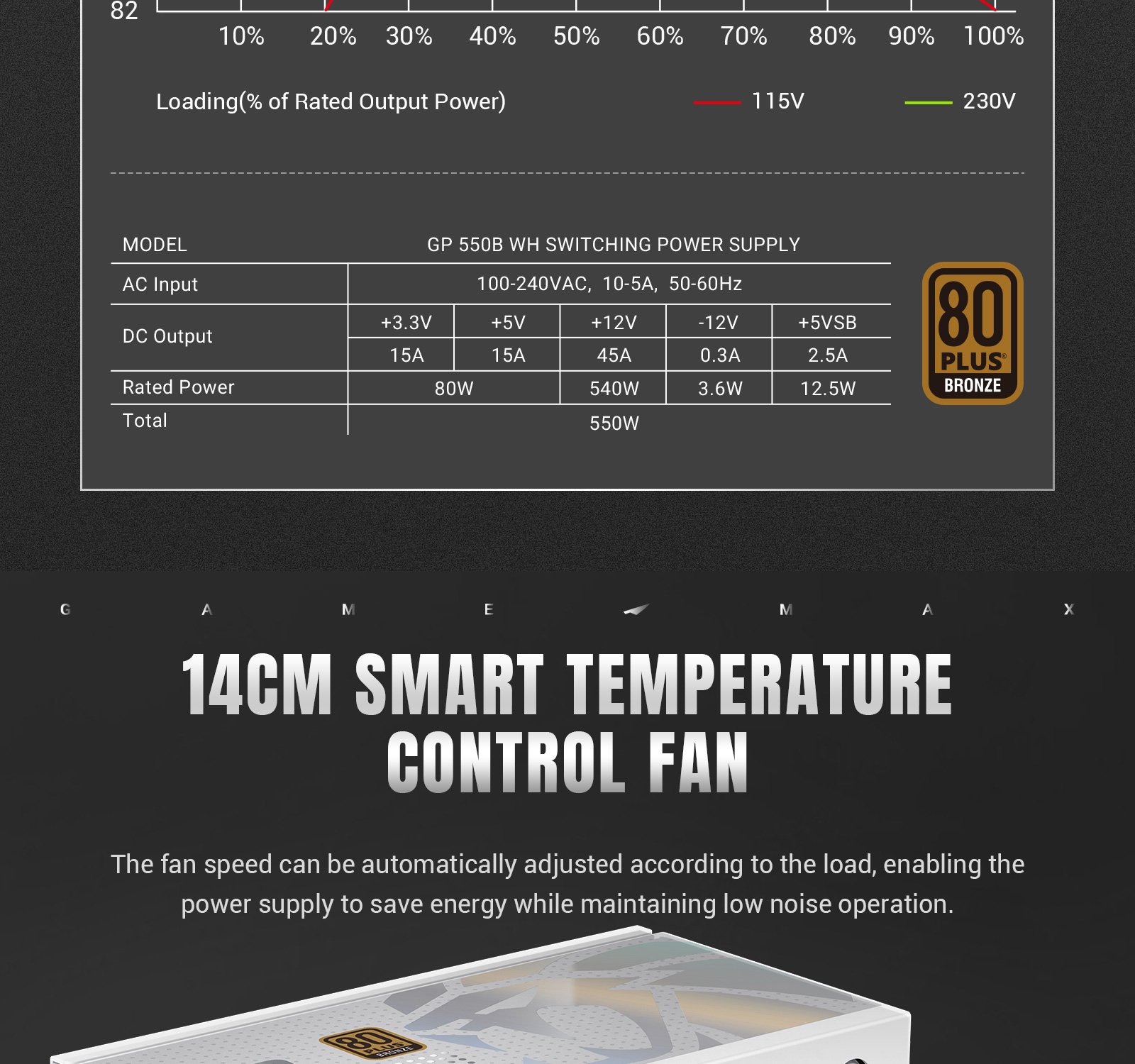 GAMEMAX GP 550B 80+ Bronze ATX3.1 Ultra-Stable Power Supply with Dual DC-DC Control, Smart Fan and Premium Cooling.