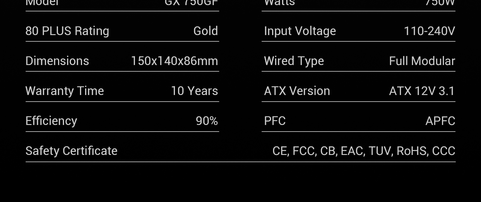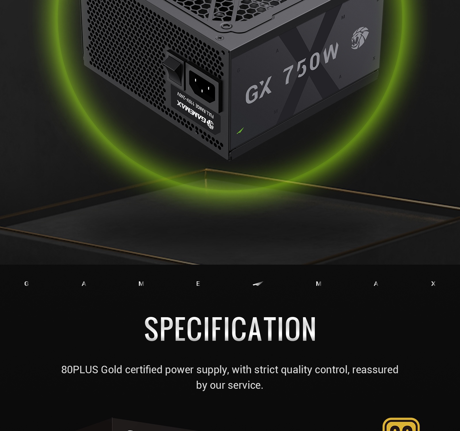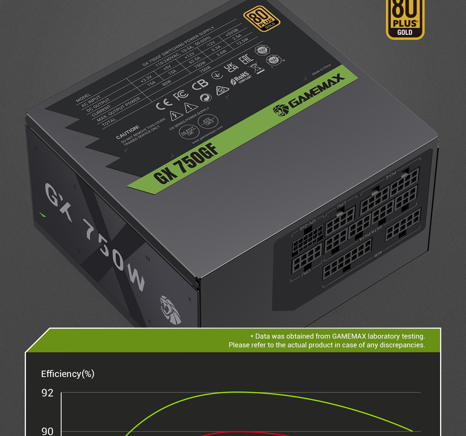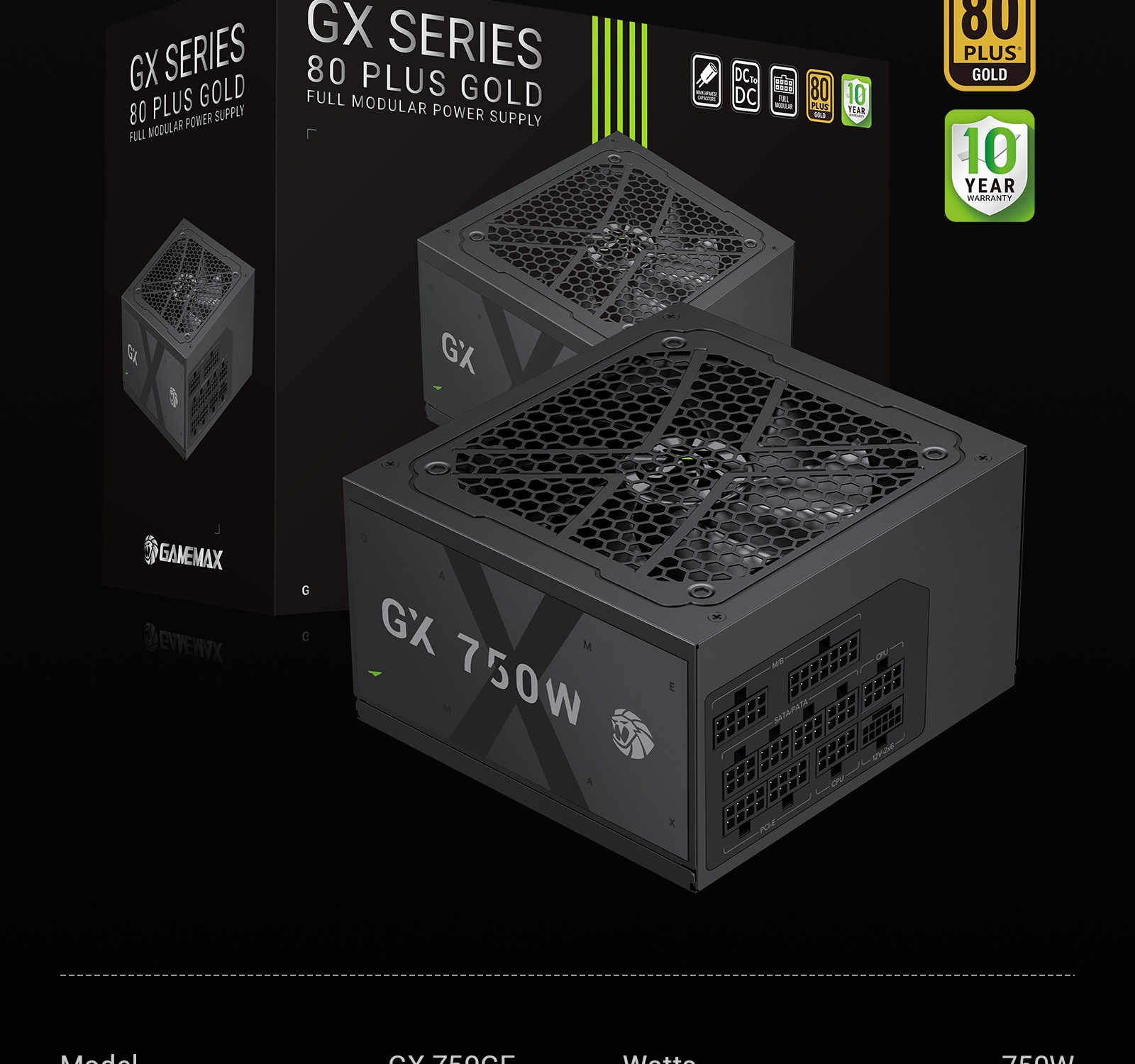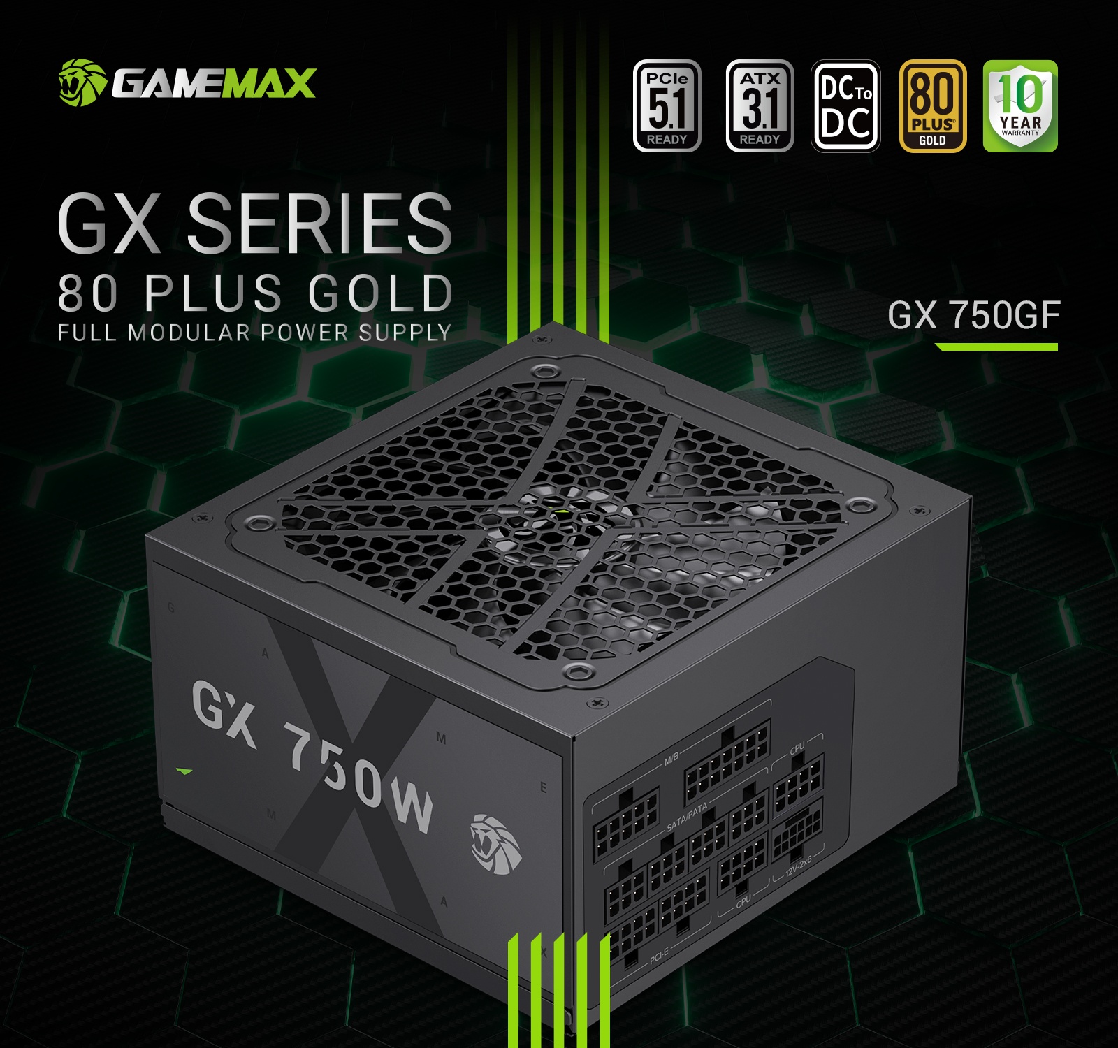 GAMEMAX GX750GF 750W 80 Plus Gold Certified Fully Modular Power Supply, ATX 3.1, 10-Year Warranty, DC-DC Conversion, Japanese Capacitors, Quiet 120mm Fan, PSU for Gaming PC • 80 Plus Gold Efficiency: 90% efficiency, DC-DC conversion for stable, low-heat power delivery• Fully Modular & ATX 3.1: Flat cables for clean builds, full compatibility with modern hardware• Premium Japanese Capacitors: 105°C rated for long-term reliability• Quiet 120mm Fan: Auto-speed control for silent cooling under load• Full Protection & 10-Year Warranty: Multi-circuit safeguards, backed by a 10-year warranty