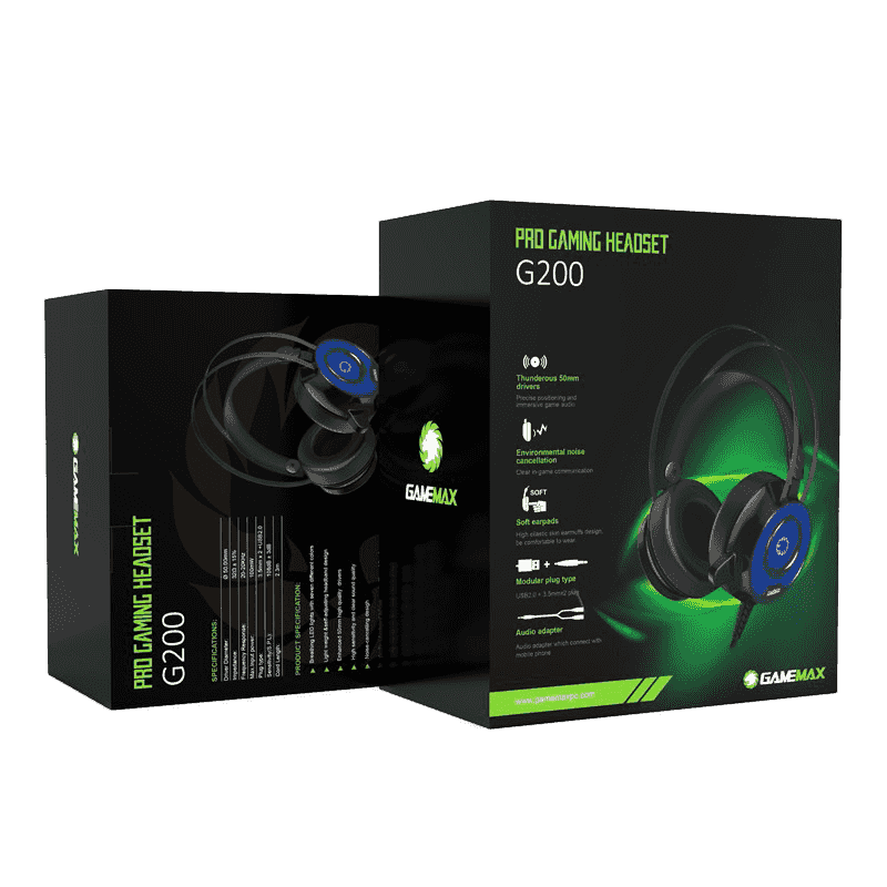 GameMax HG200 Headset. Driver Diameter: 50mm. Frequency Range: 20-20.000Hz• Sensitivity: 108 dB( at1 KHz, 1mW )• Impedance: 32 Ohm• Cable Length: Single-sided 2.5m• Plug type: 3.5mmX2+ USB