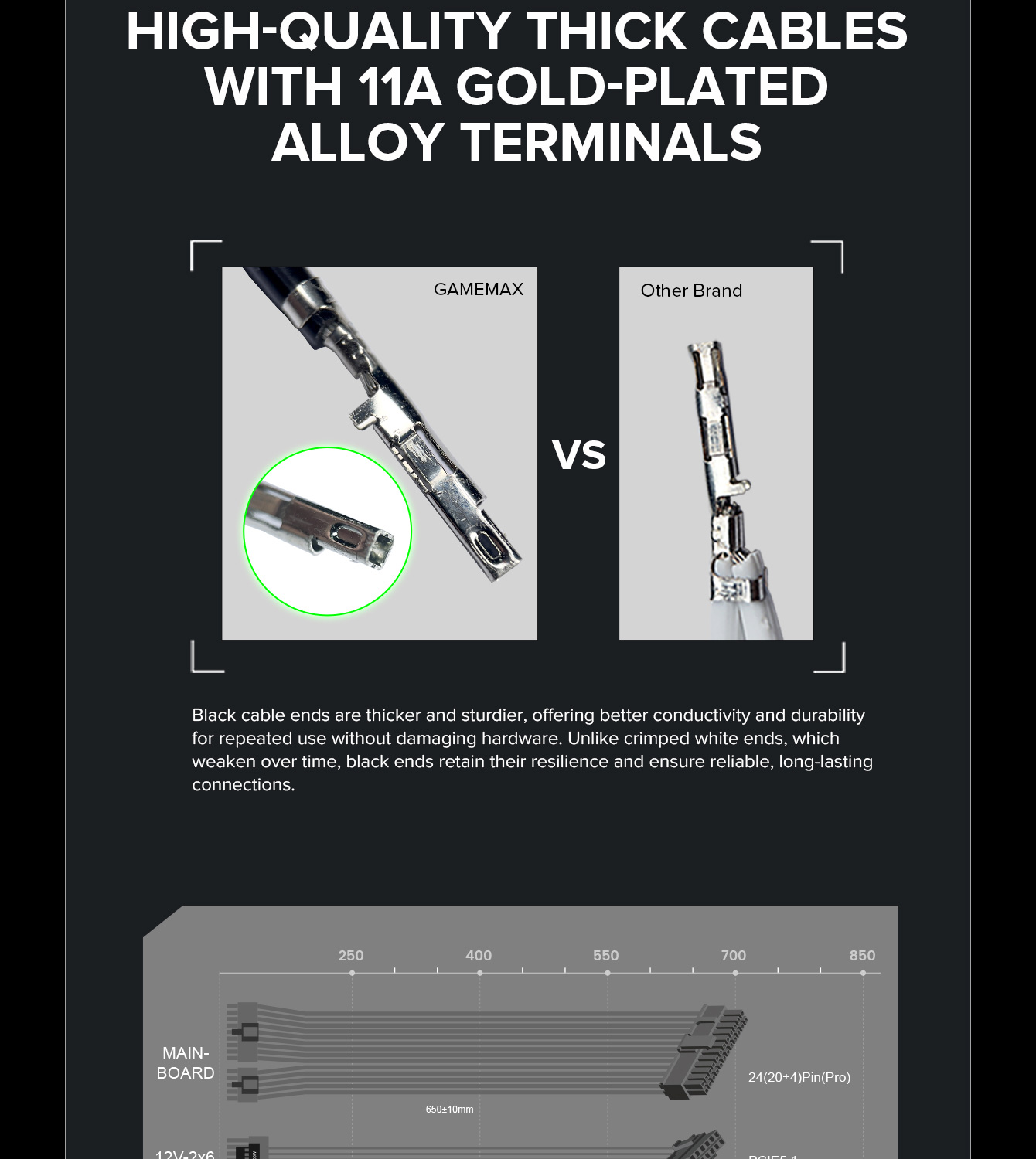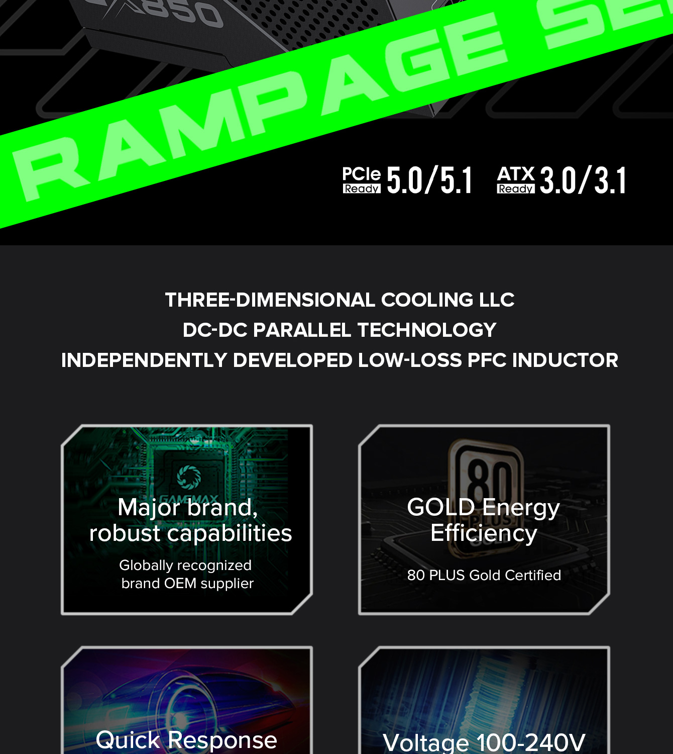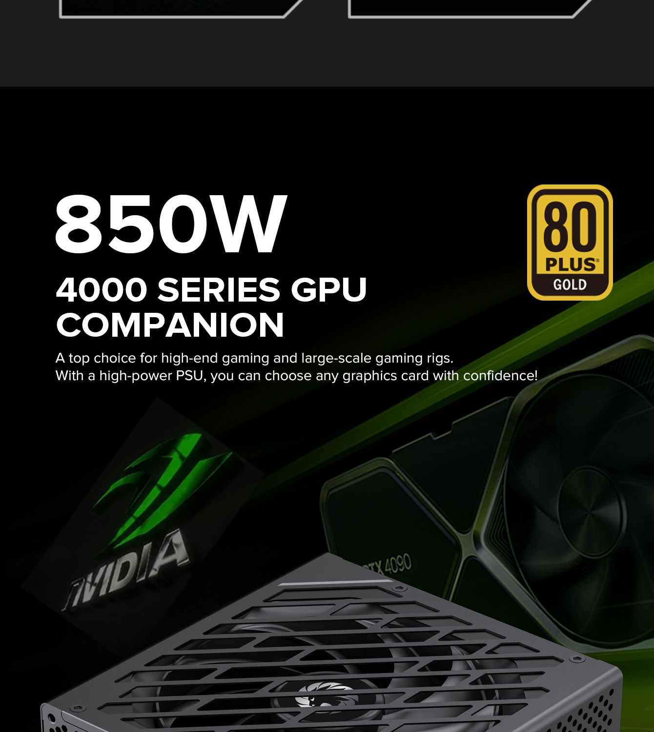 850W 80 Plus Gold ATX3.1 PCIe5.1 power supply with PCIe5.1 12V-2*6 connector for direct RTX™ 40 Series GPU connection, minimizing current loss.