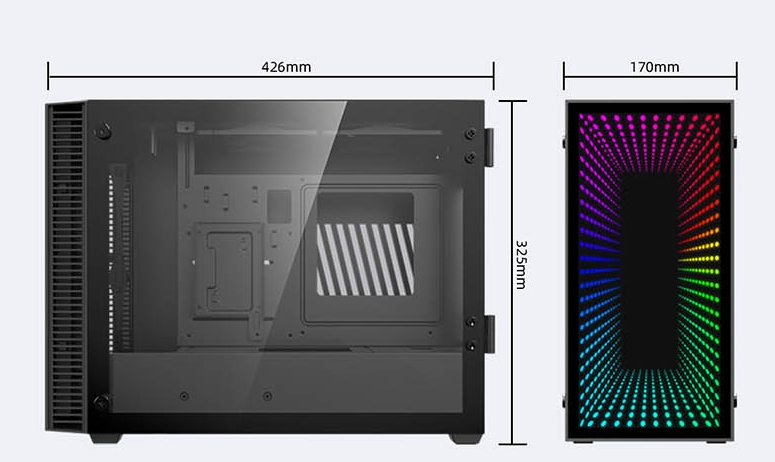 Вот.Глубина GameMax Это не просто небольшое дело ITX; Это манифест любой версии ПК. Благодаря своей уникальной передней панели с безграничными зеркалами Abyss предлагает потрясающий визуальный эффект, который отличает его от других корпусов. Зеркало создает иллюзию бесконечной глубины, которая усиливается настраиваемым освещением ARGB, которое может синхронизироваться с другими компонентами для получения последовательного внешнего вида.