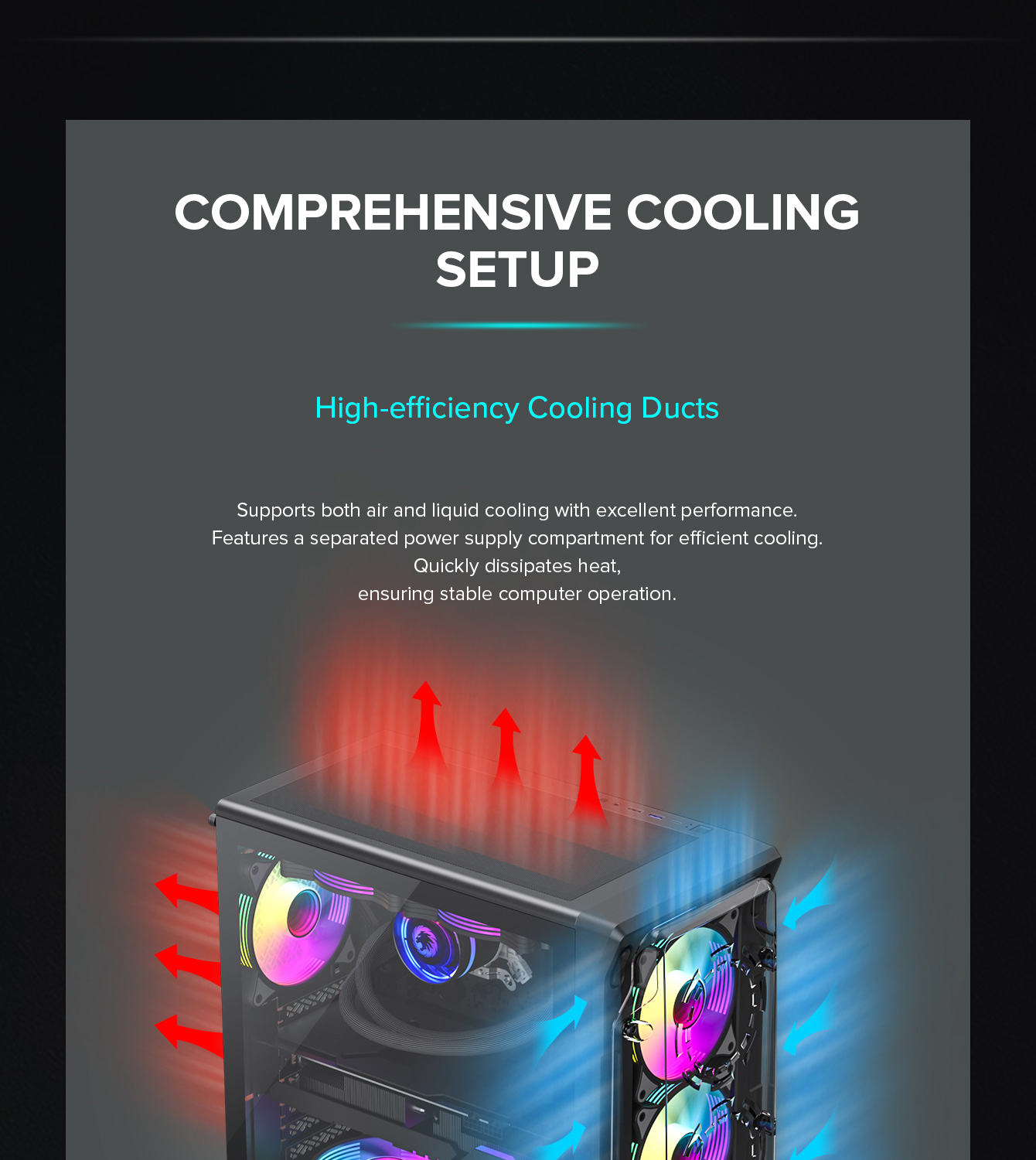 • Передняя панель выполнена из акрилового материала, что обеспечивает циркуляцию воздуха и эффективно предотвращает попадание пыли, а также полностью демонстрирует бесконечные ослепительные эффекты RGB подсветки.