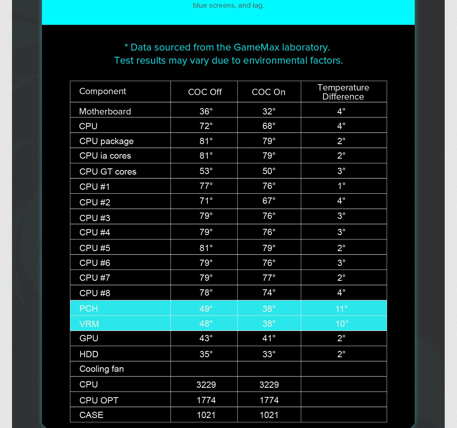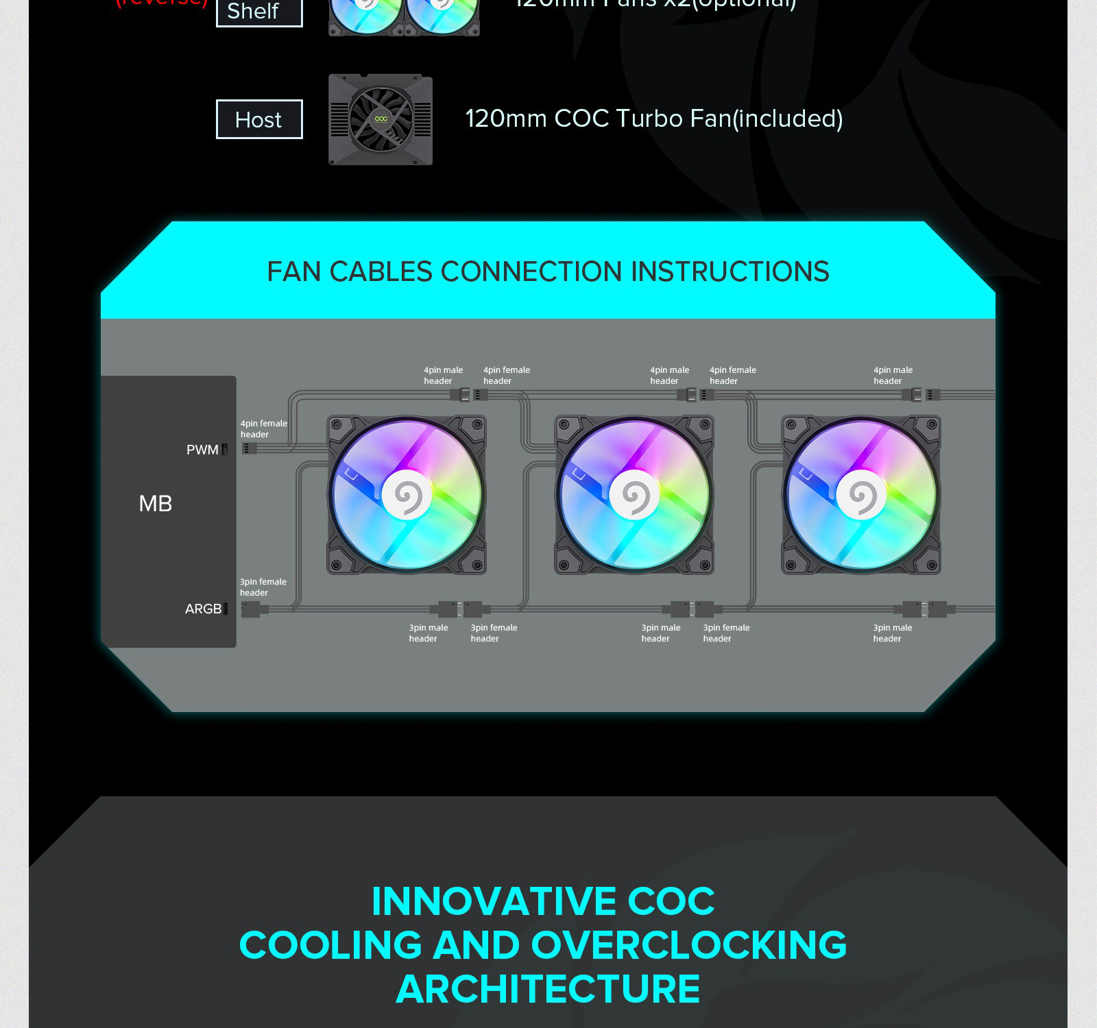 • Отличное охлаждение - Вмещает до 9 вентиляторов (включая 5 встроенных вентиляторов, включая турбовентилятор COC) и радиаторы до 360 мм для оптимального охлаждения.