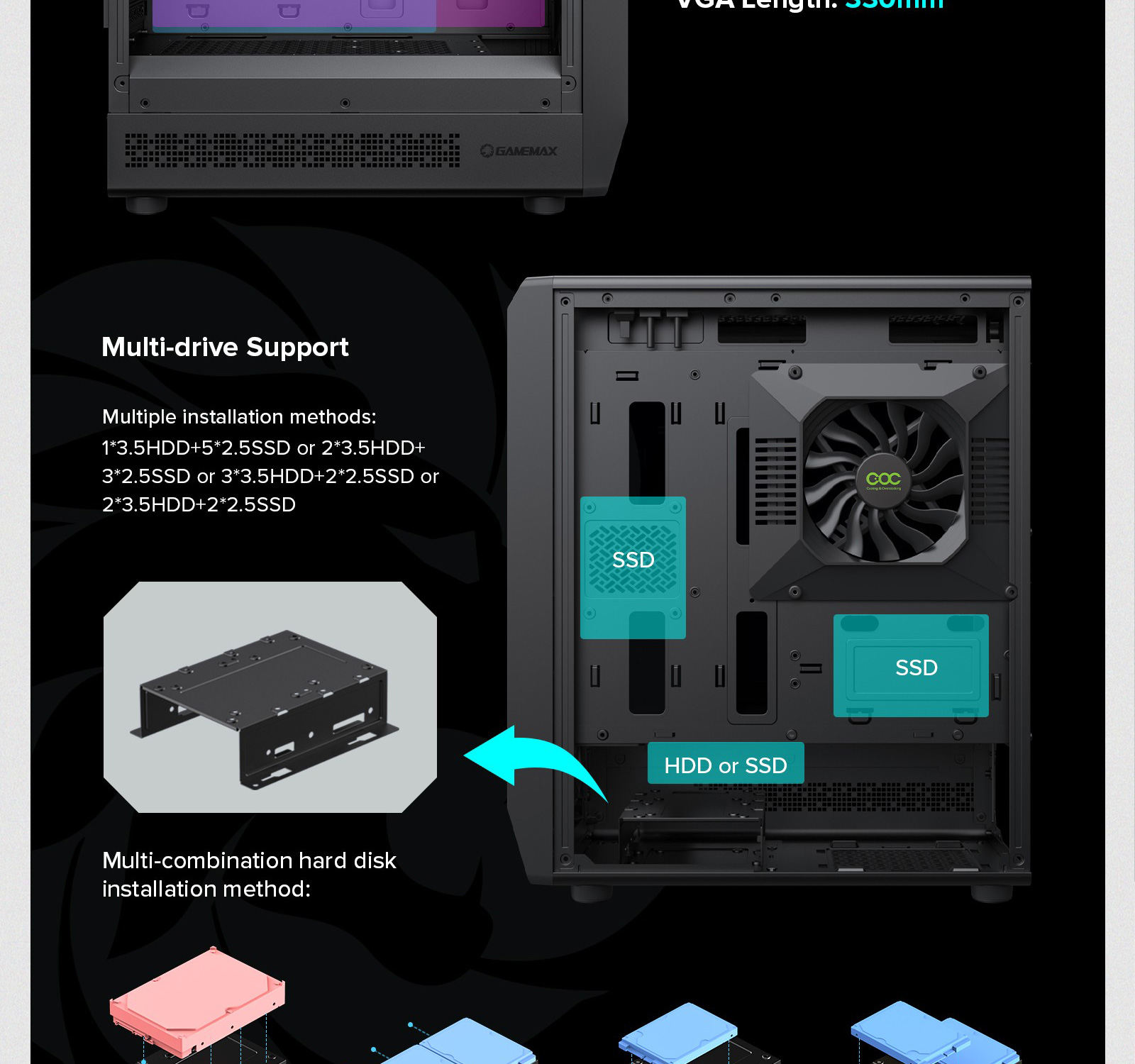 | Internal Drive Bay(s) | 3.5" (HDD) | 1*3.5HDD+5*2.5SSD or 2*3.5HDD+3*2.5SSD or 3*3.5HDD+2*2.5SSD or 2*3.5HDD+2*2.5SSD |
