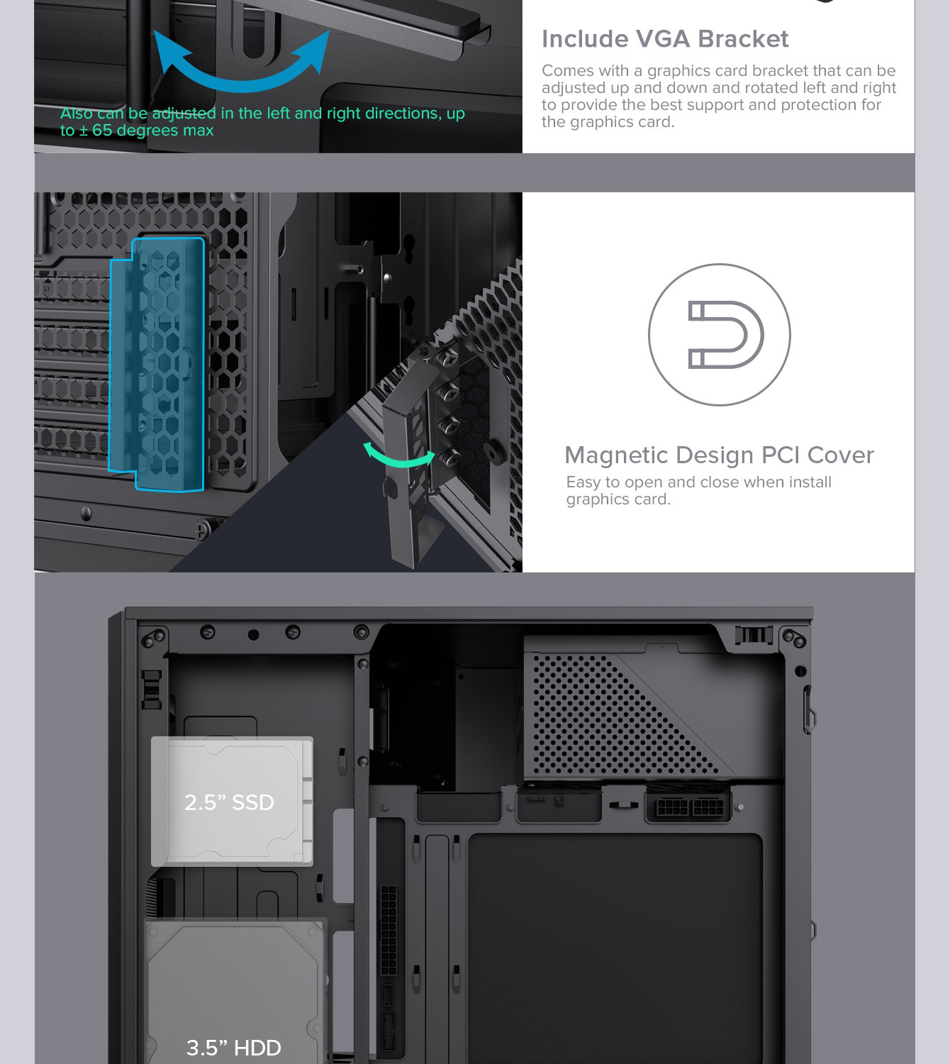 • Совместим с материнскими платами формата MATX и конфигурациями с задними панелями, поддерживает графические карты с длиной до 4,5 слотов.