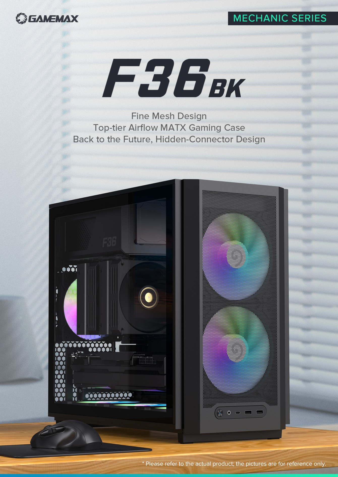 GameMax F36 BK Micro-ATX Игровой Корпус: стильный, оптимизированный для воздушного потока и простой в установке премиум-корпус с прочной стальной рамой и 4,0 мм закаленным стеклом.• Оснащен 3 вентиляторами ARGB/PWM для улучшенной эффективности охлаждения.• Модуль ввода-вывода со сменным логотипом и позициями подключения.• Поддерживает воздушные кулеры высотой до 166 мм и жидкостные кулеры 240/280 мм.• Совместим с материнскими платами формата MATX и конфигурациями задней панели, поддерживает видеокарты до 4,5 слотов.• Безвинтовая система быстрого снятия передней и боковой панелей.• Верхнее расположение отсека для блока питания для оптимальной компоновки.