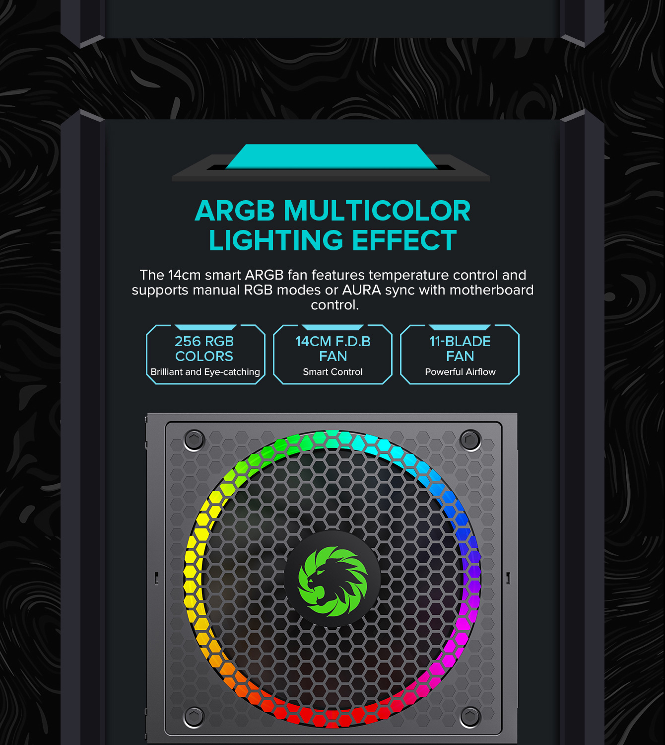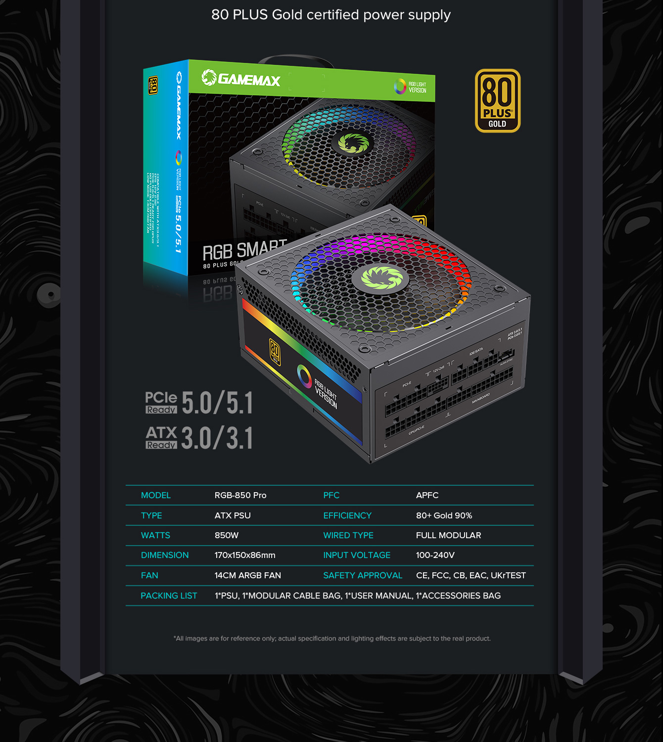 GameMax 850W блок питания для ПК, полностью модульный, сертифицированный 80+ Gold, с ARGB-подсветкой• Мощность 850 Вт и сертификация 80+ Gold: Энергоэффективность до 90%, что снижает потери энергии и обеспечивает стабильную работу системы.