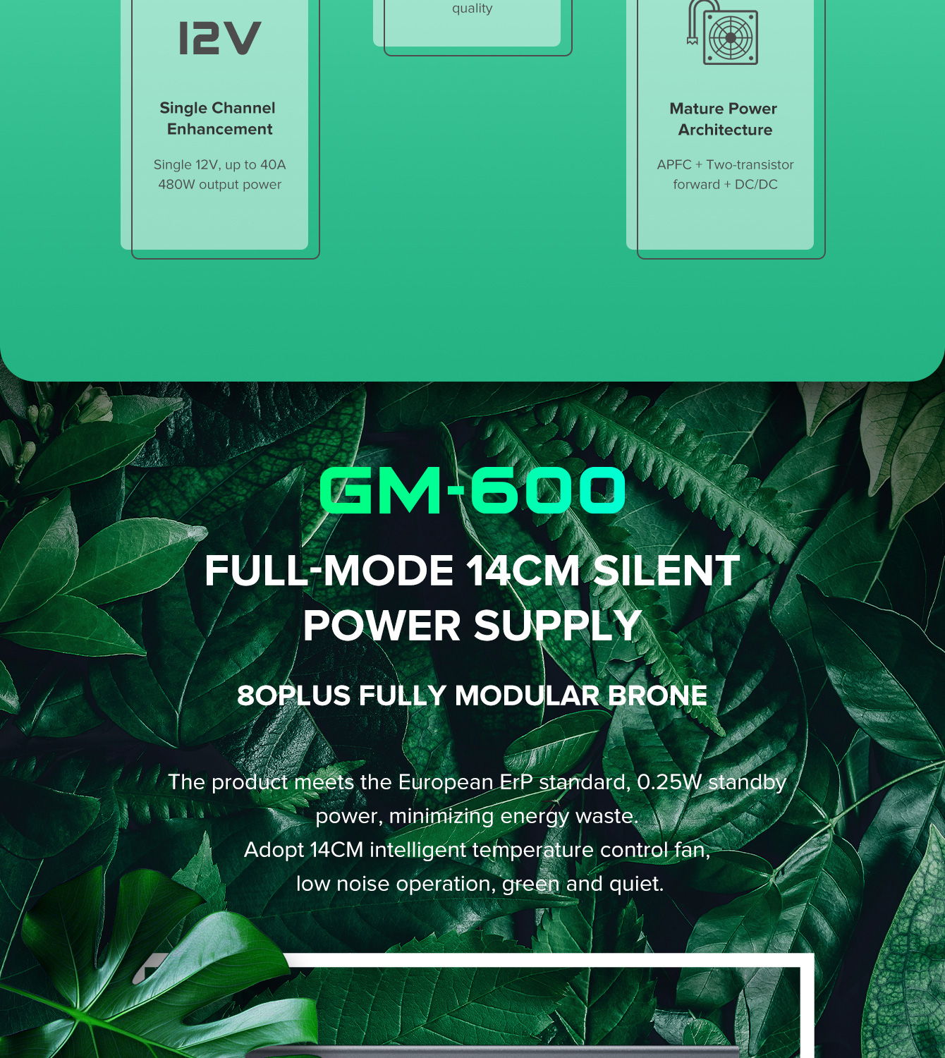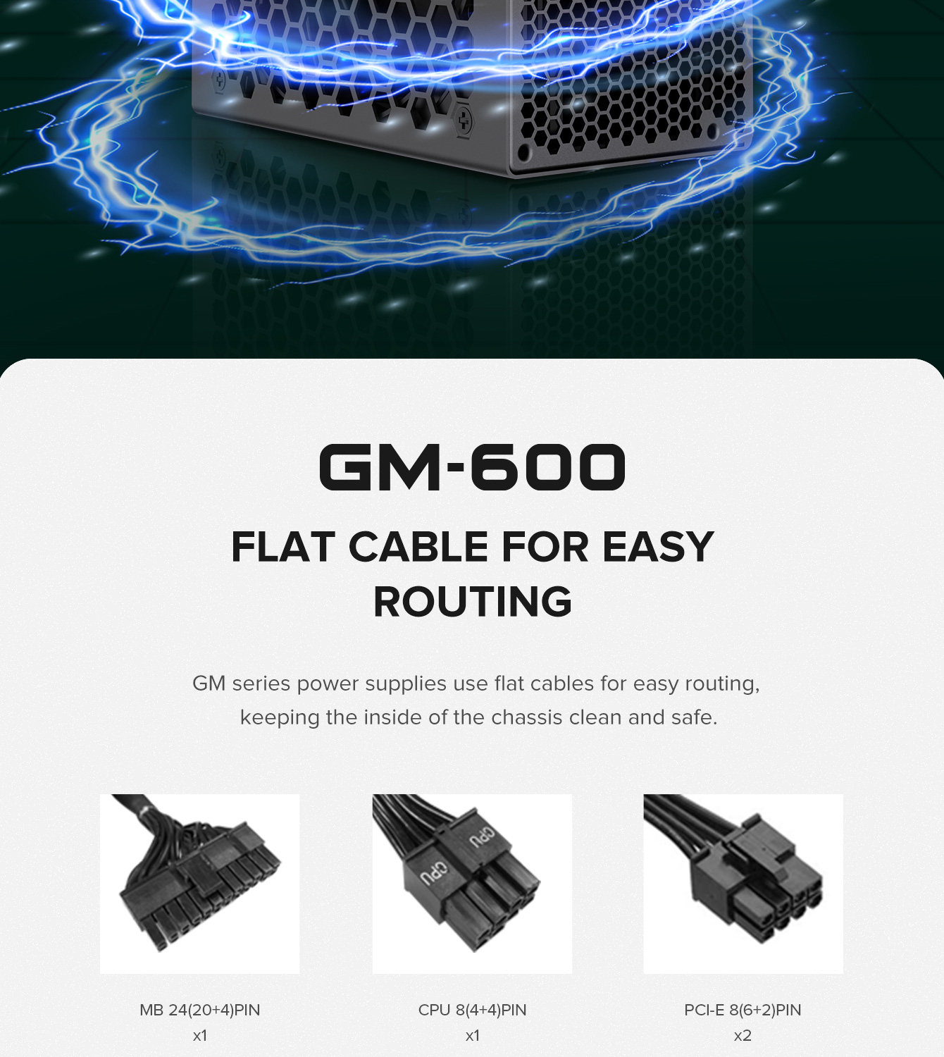 Блоки питания для компьютеров серии GM-600 года с полностью модульными кабелями, позволяющими подключать только необходимые вашей системе кабели.