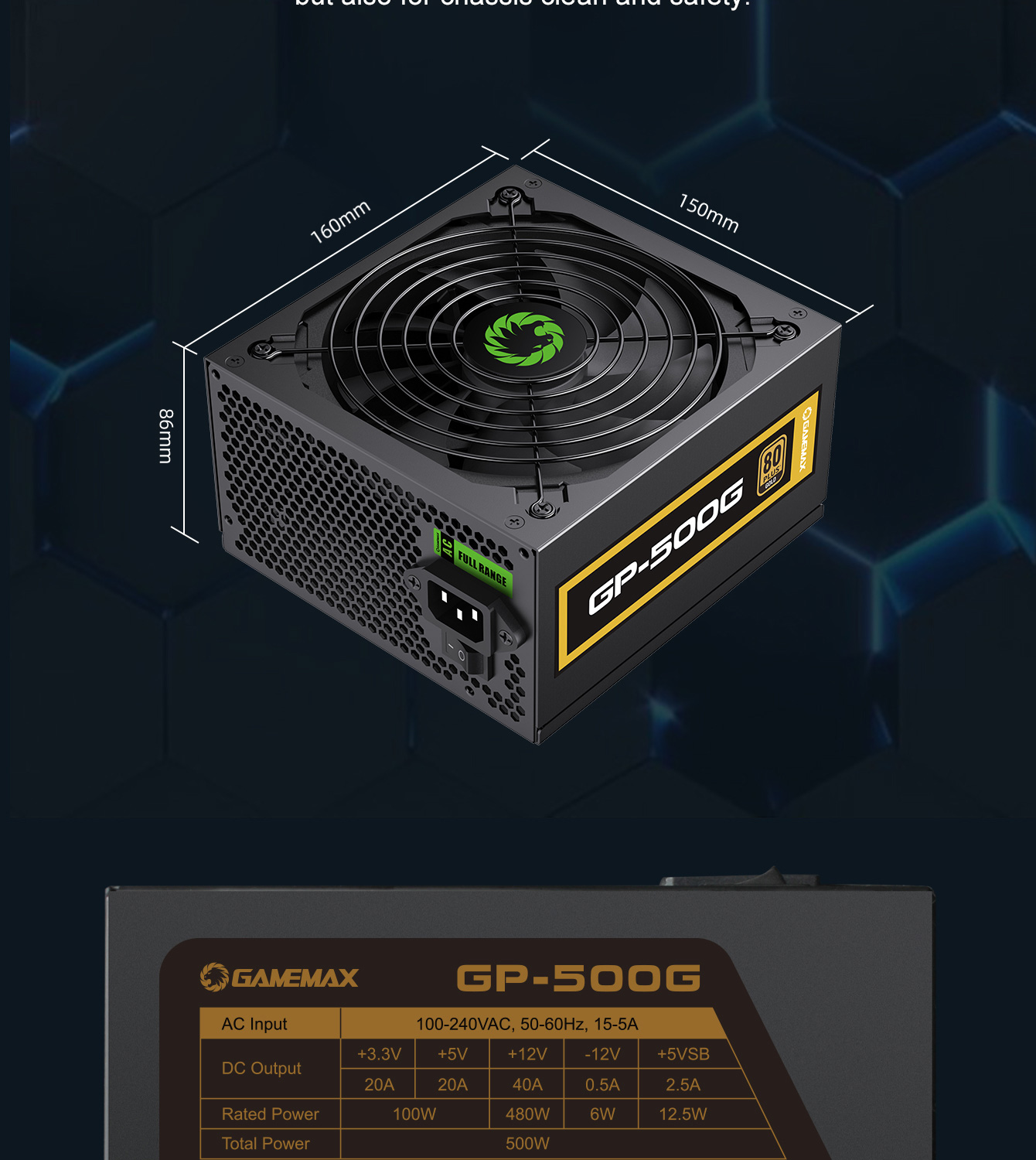 Блок питания для компьютеров GameMax GP-500 с вентилятором 14 см, сертификацией 90+ Gold Plus