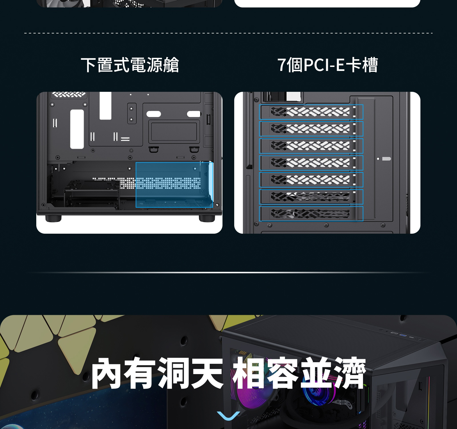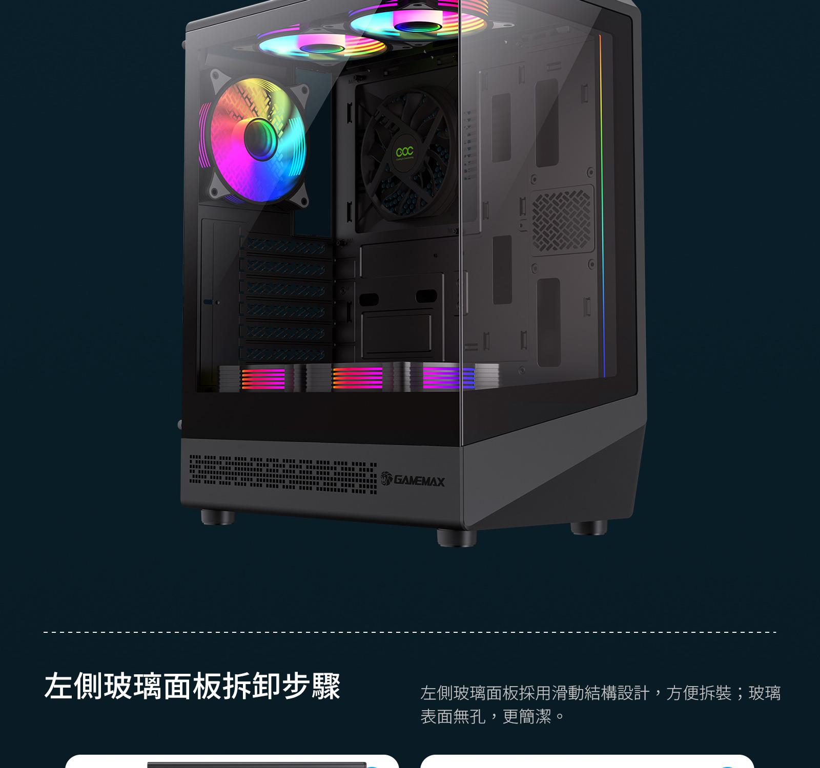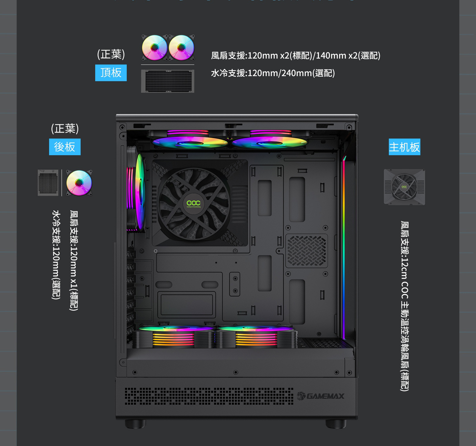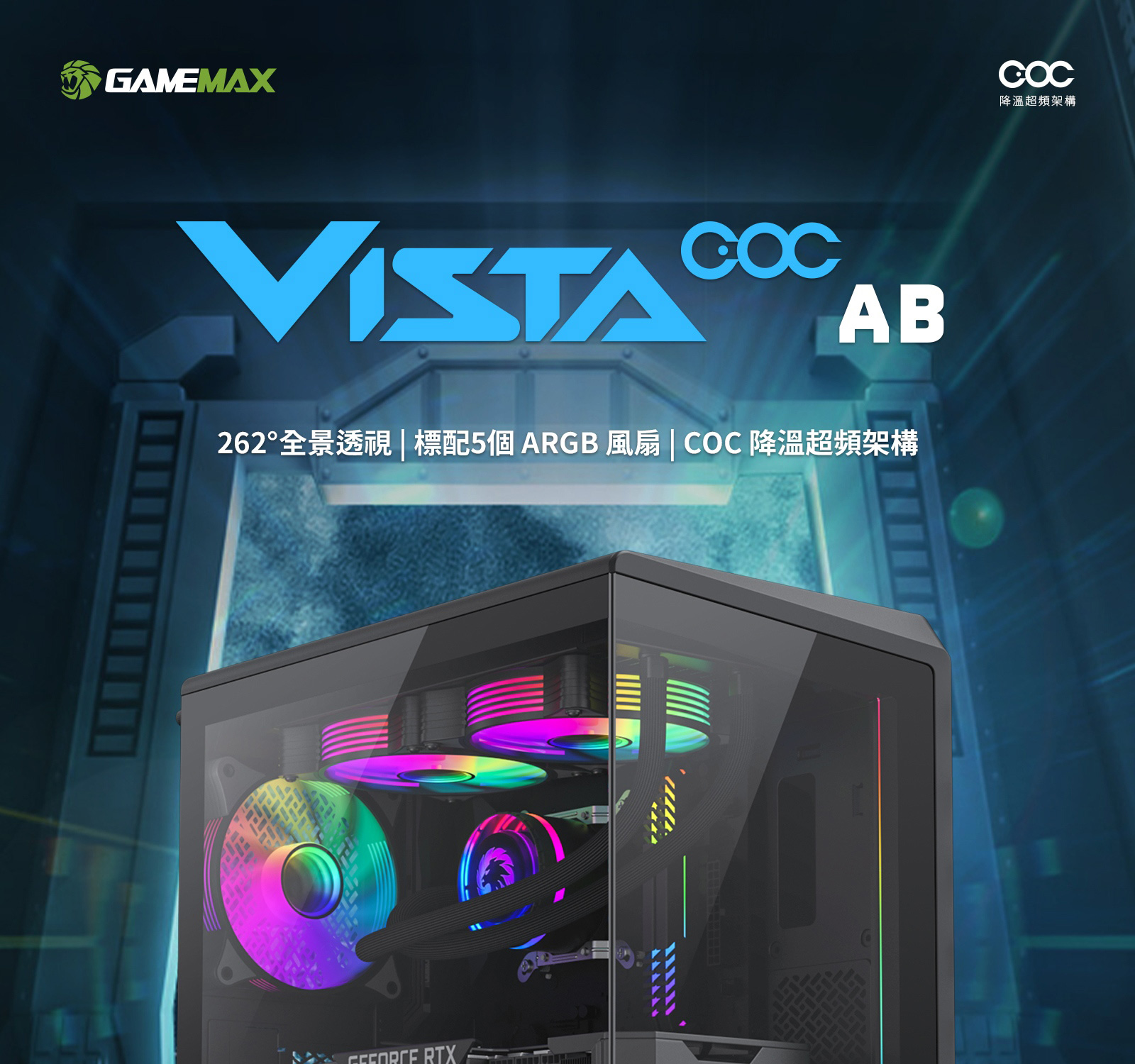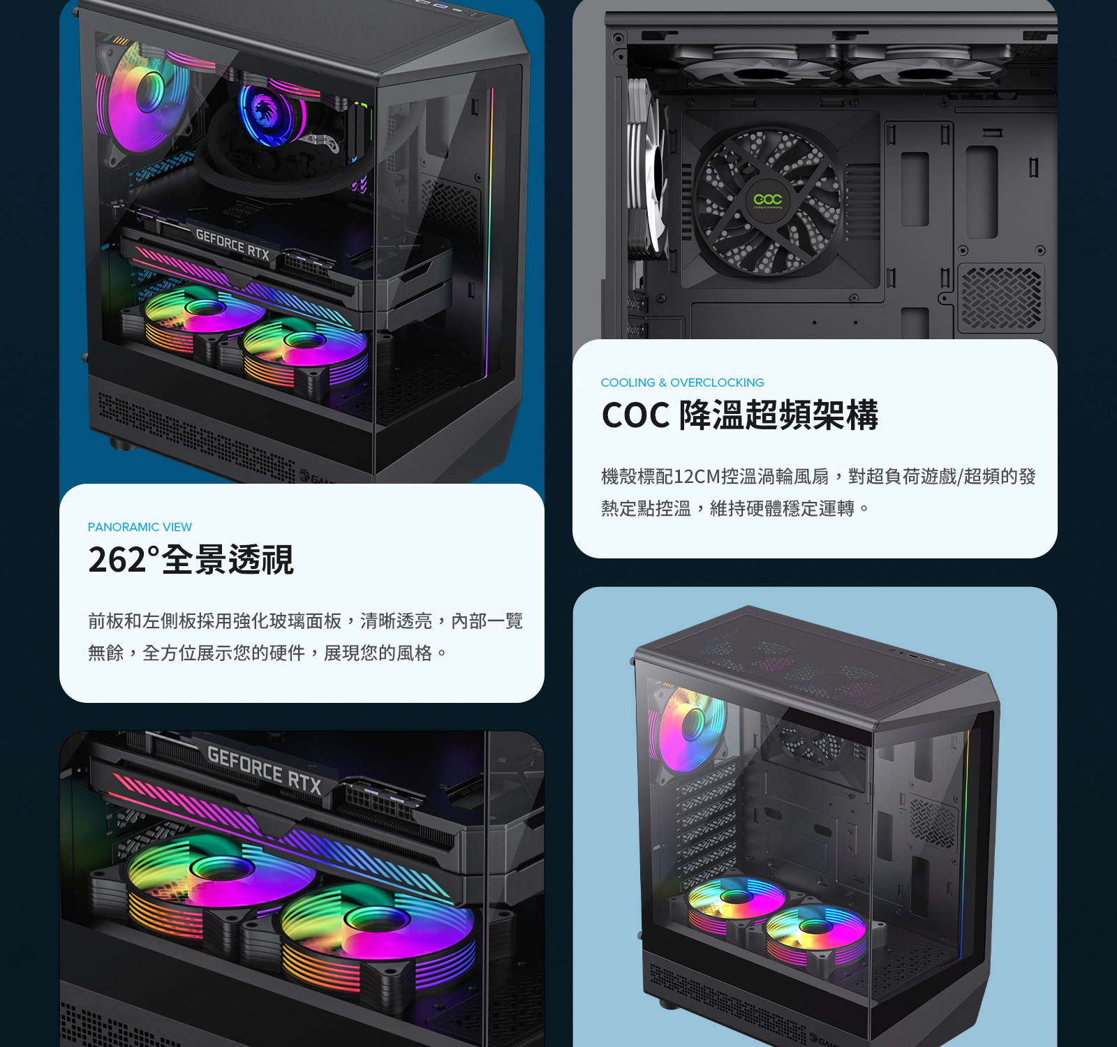 ATX中塔遊戲機箱具備 262° 環景視角、專利 COC 散熱技術、5 顆 ARGB 風扇,並採用流線型設計與模組化佈局,為靈活組裝提供更多可能。