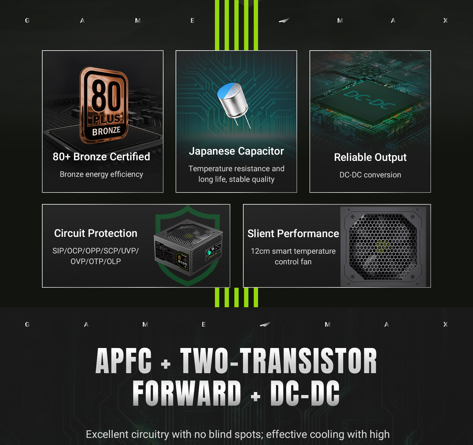 • Equipped with multiple safety features including OVP, OPP, UVP, SCP, OTP, and more — protecting your system from electrical damage during operation.