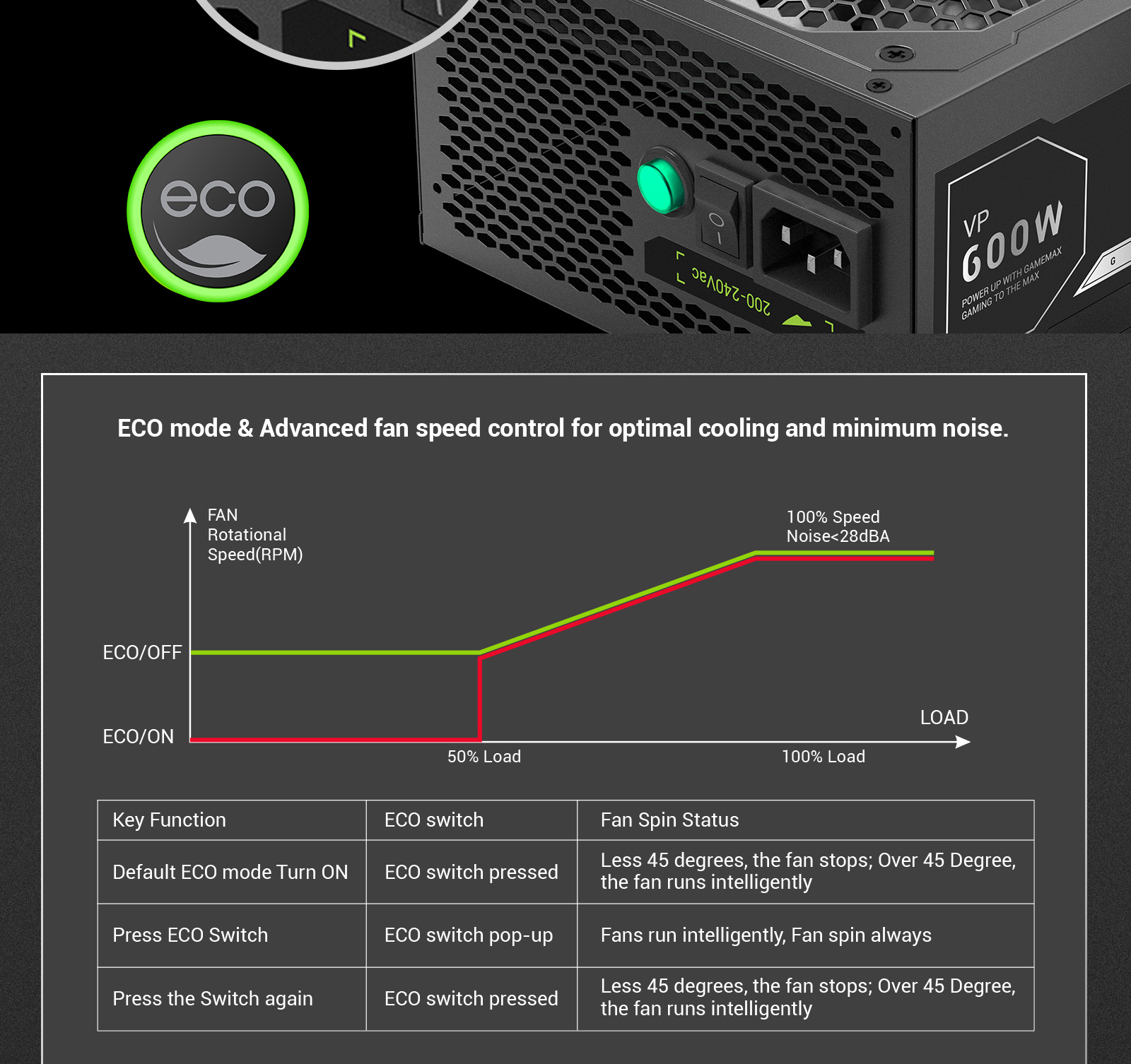 • A 12cm HDB fan with ECO Mode automatically adjusts for temperature and noise, staying silent when your system is idle or under light use.