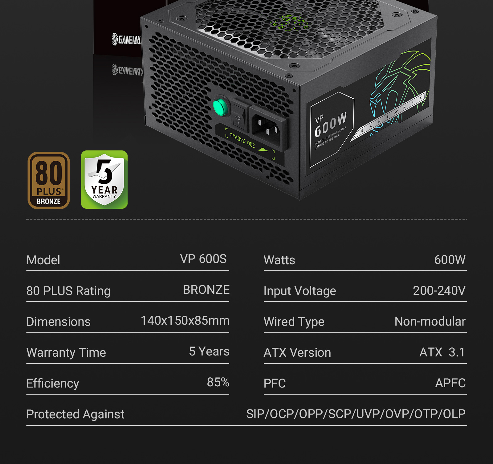 VP 600S ATX3.1 Power Supply - 80 PLUS Certified, 5-Year Warranty, High Efficiency & Reliability, Great Value for System Builders
