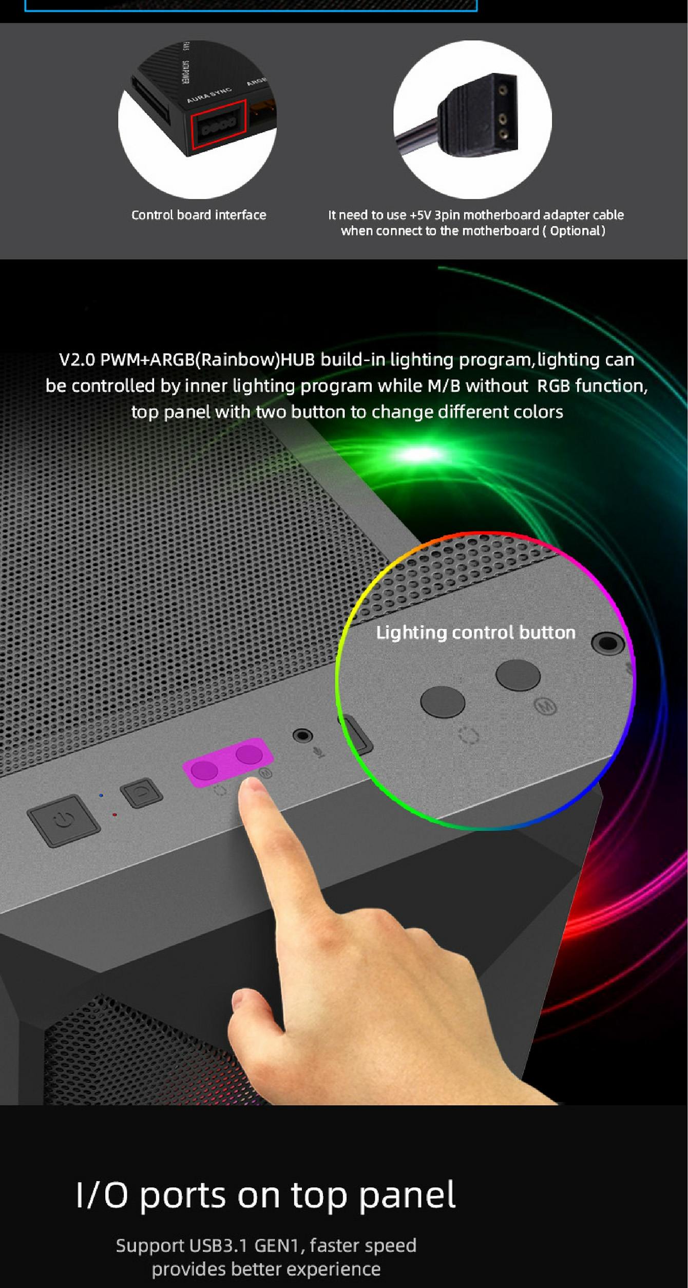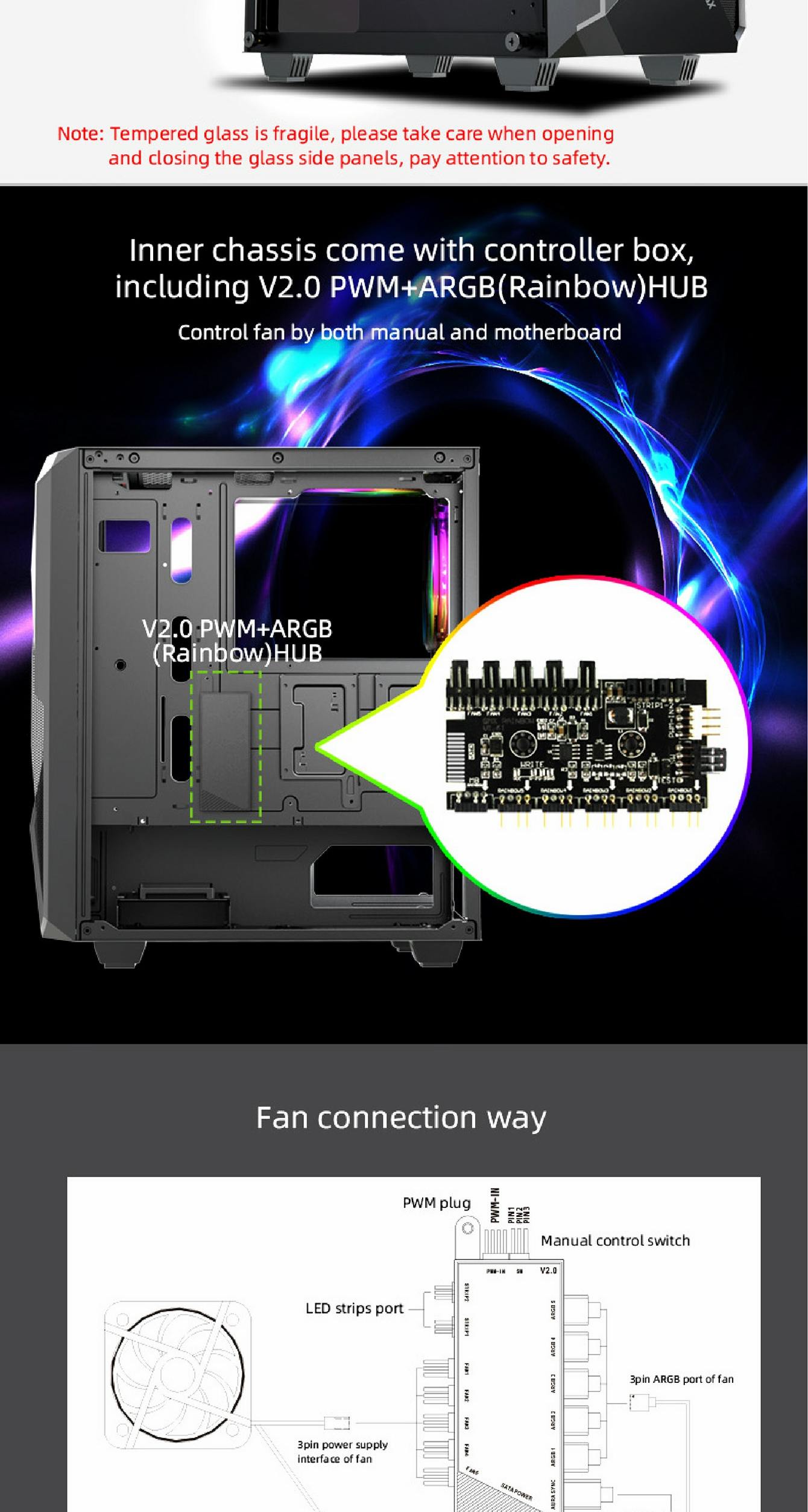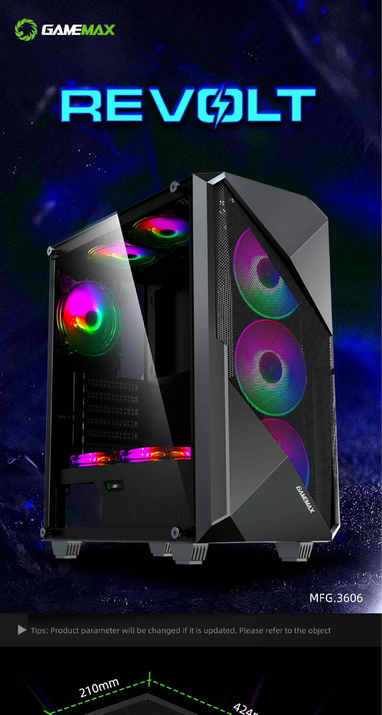 • The Revolt comes with a PWM and Rainbow ARGB hub with a 3pin ARGB header ,it can be over 100 light mode also it is support to connect directly to your motherboard by optional Aura SYNC cable, allowing you to control your fans and LED strip via mobo provided software.