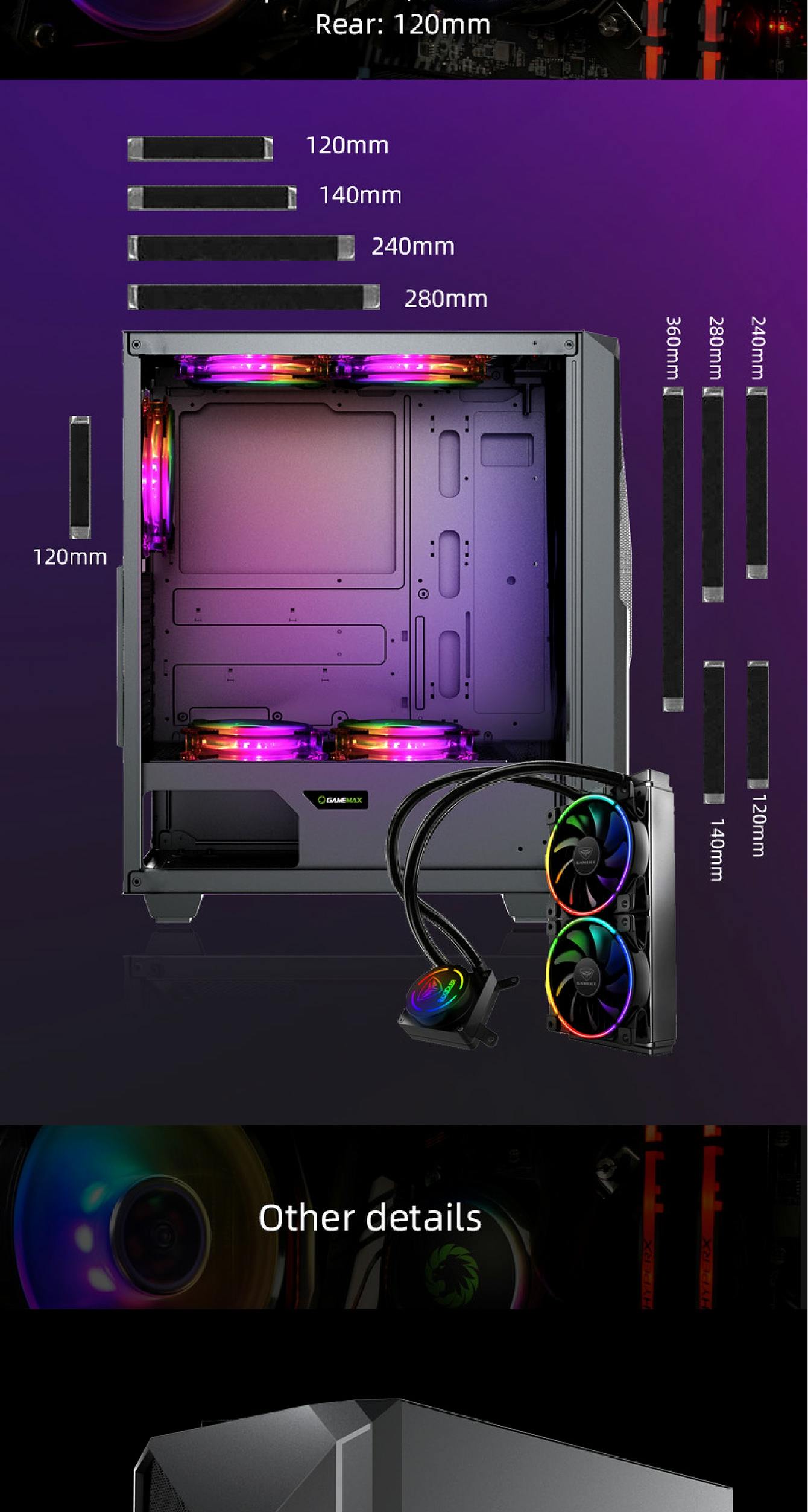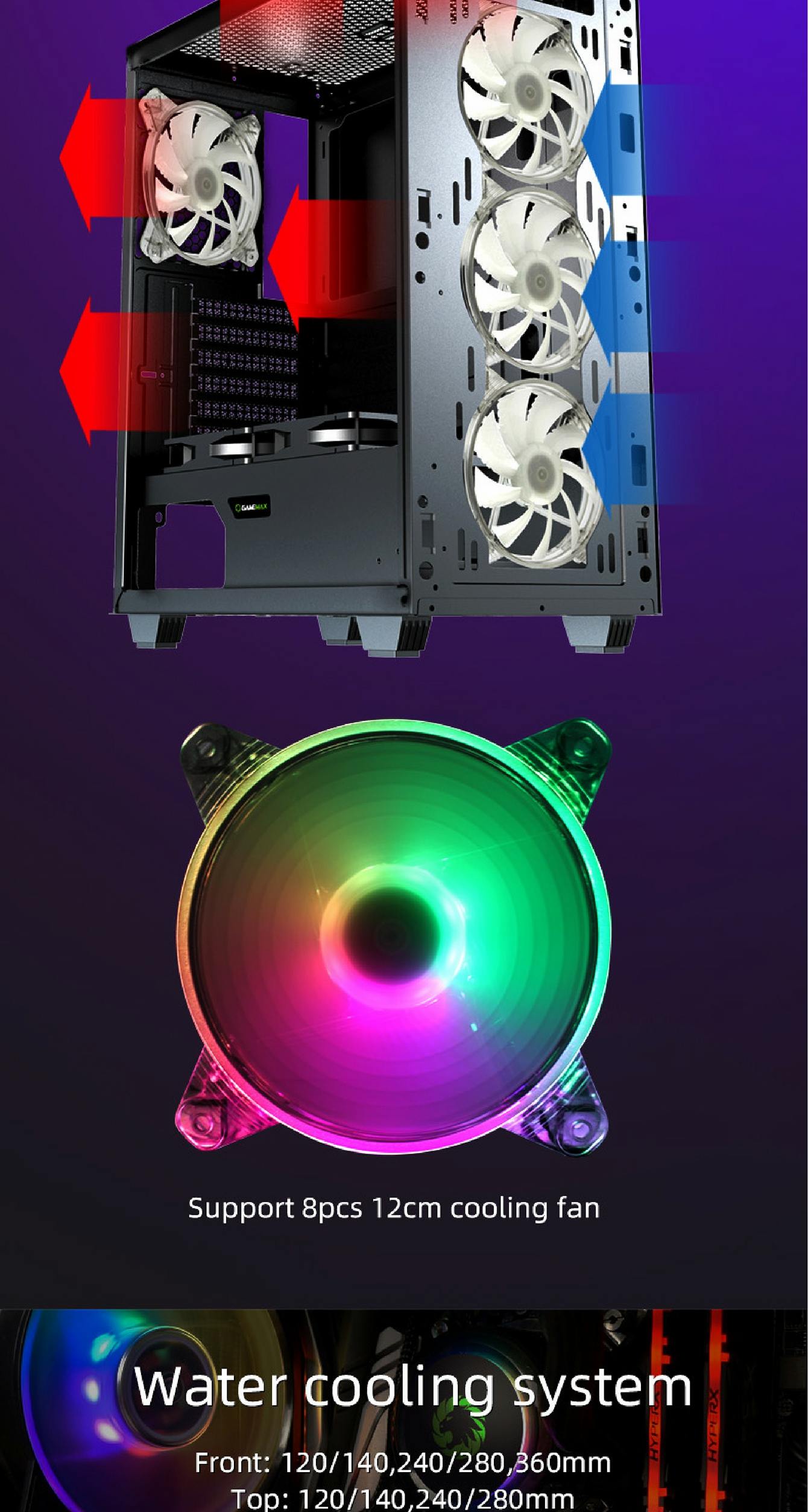 | Water Cooling Support (Radiator Size) | Front | 120mm, 140mm,240mm,280mm,360 |